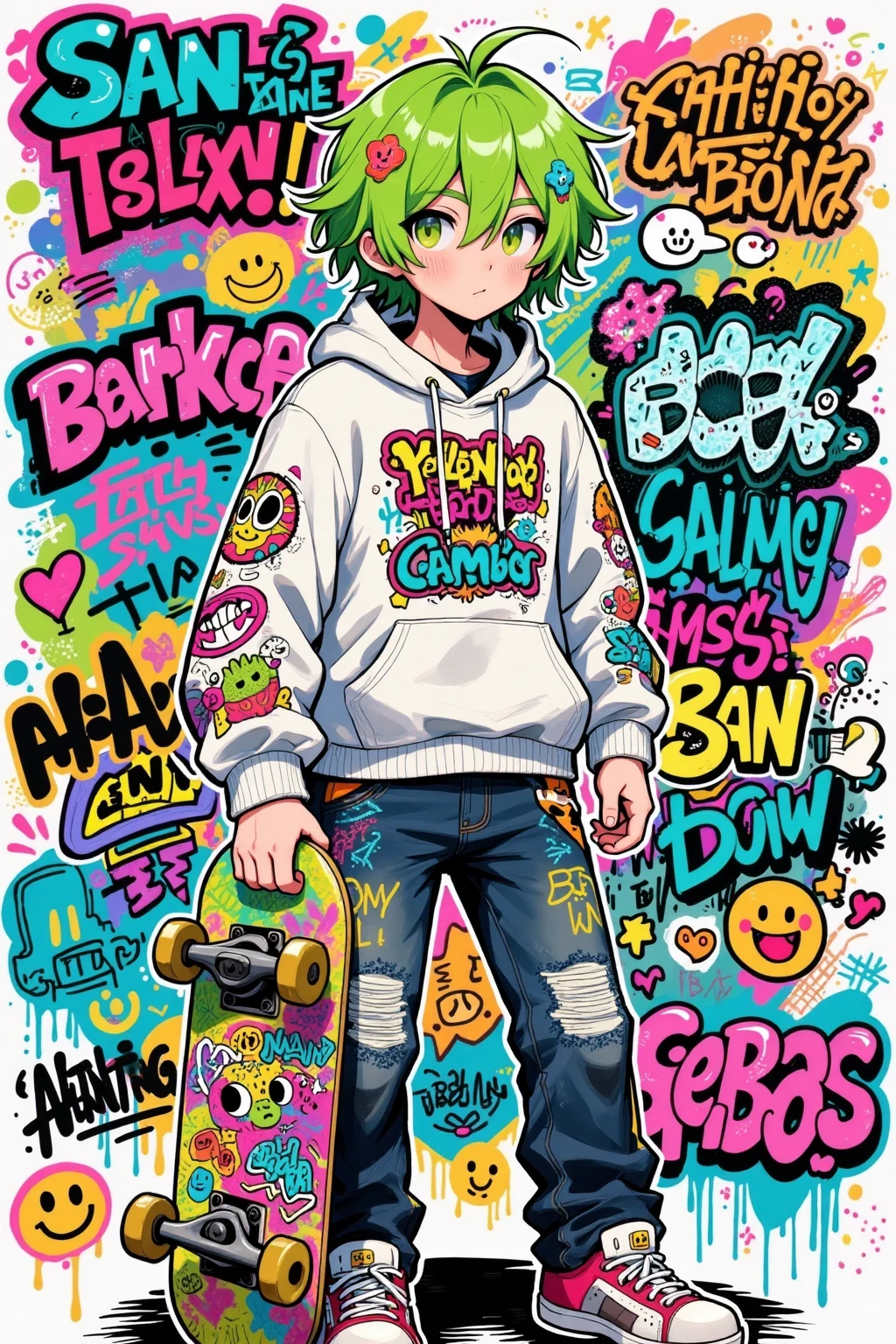 Vibrant graffiti - style anime characters, green - haired character, casual hoodie, skateboard with graffiti, lively urban setting.