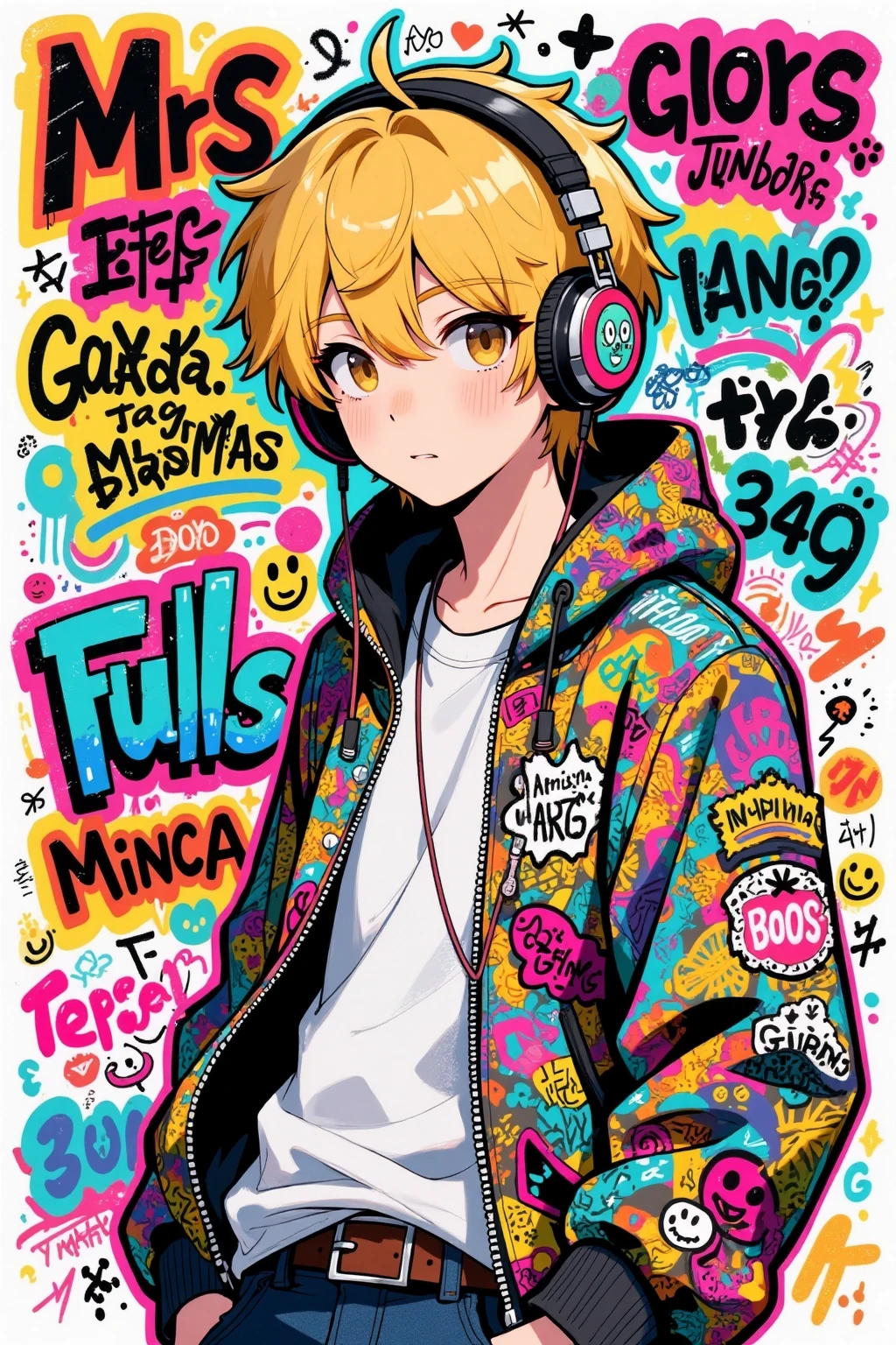 Vibrant graffiti - style anime characters, blonde boy with headphones, colorful jacket, music - themed tags, energetic vibe.