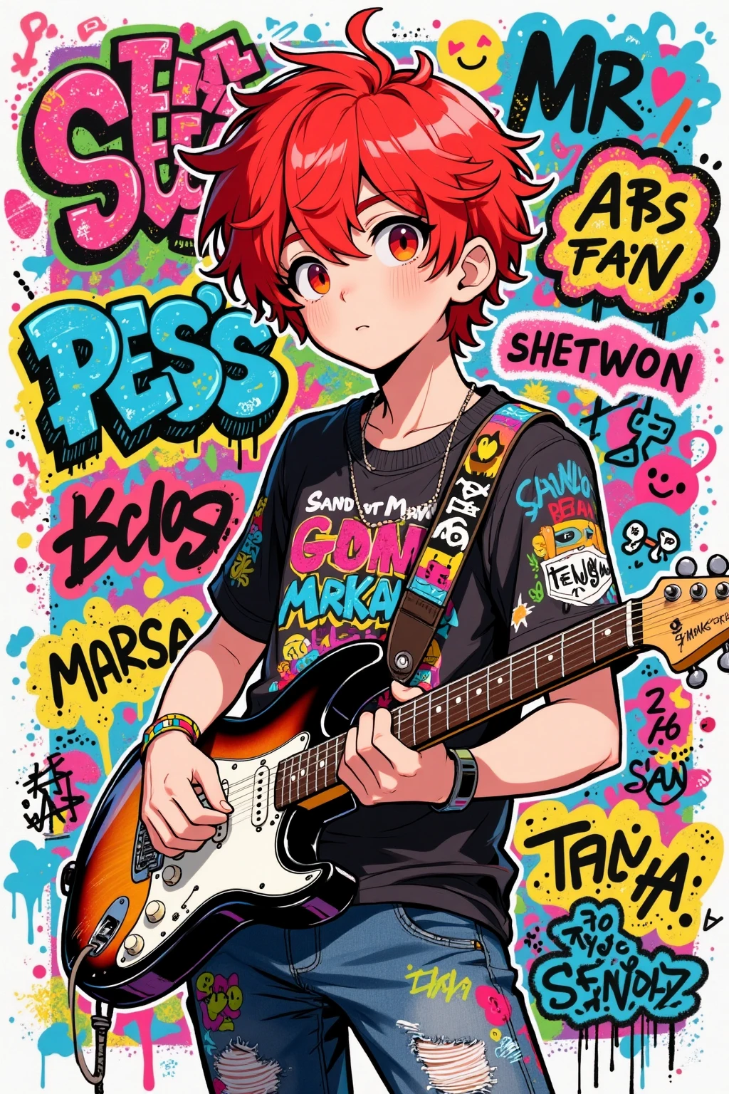Vibrant graffiti - style anime characters, red - haired boy, playing electric guitar, graffiti - covered shirt, rock - and - roll tags.
