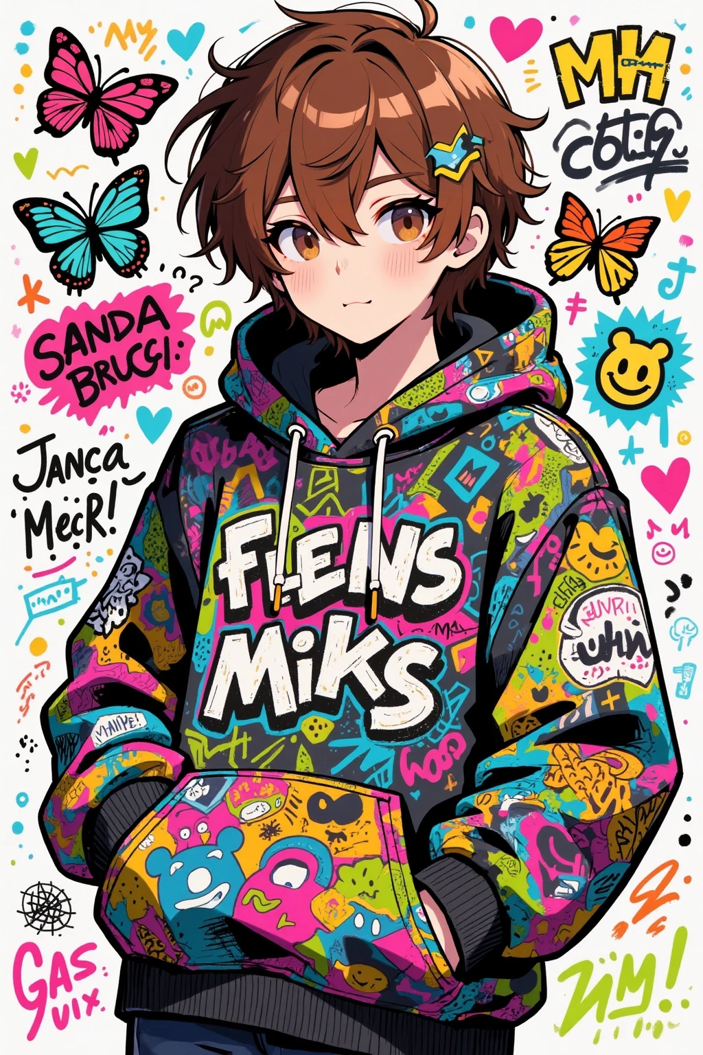 Vibrant graffiti - style anime characters, brown - haired character, hoodie with unique prints, graffiti butterflies, artistic mood.