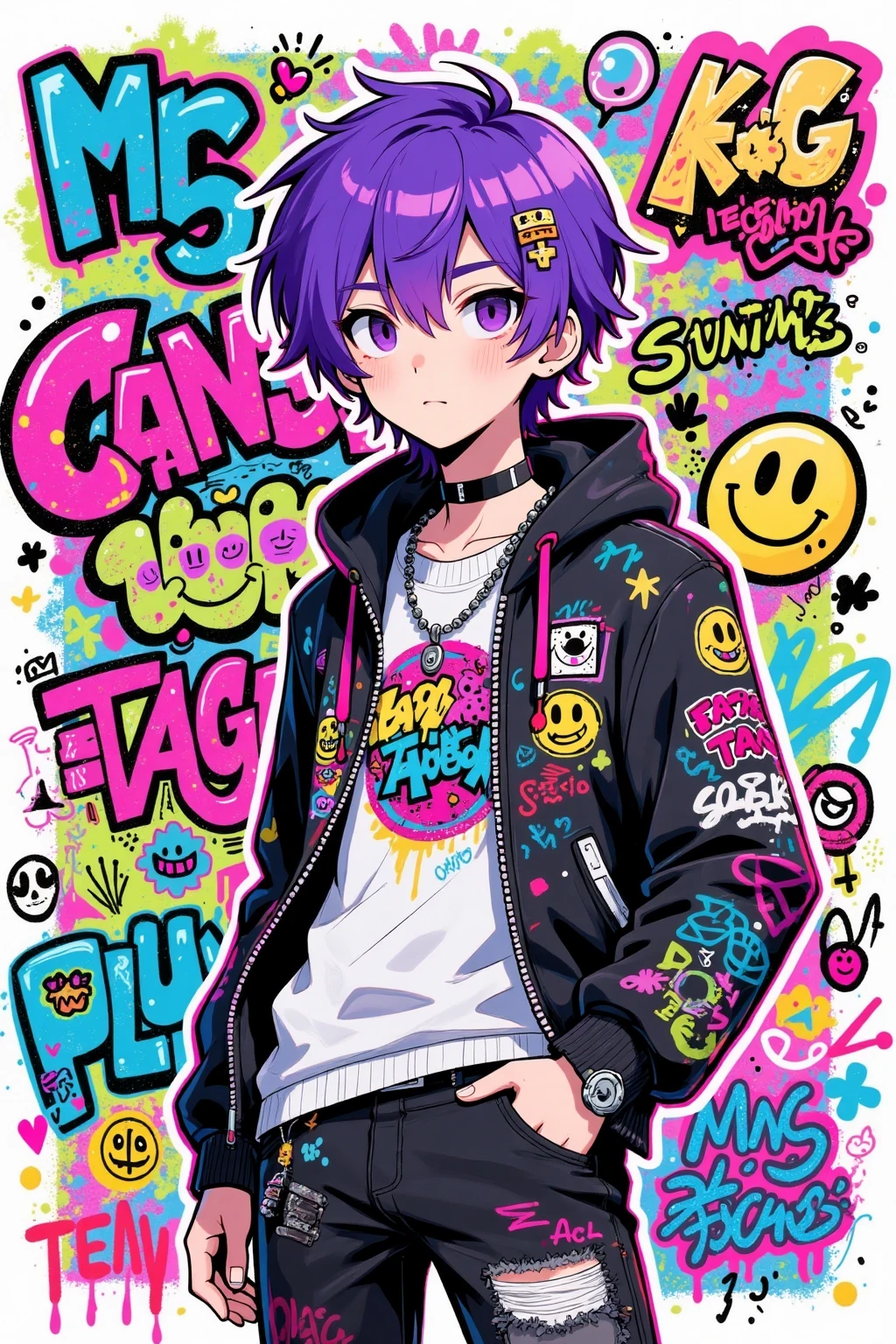 Vibrant graffiti - style anime characters, character with purple hair, stylish outfit, various graffiti symbols, modern street look.