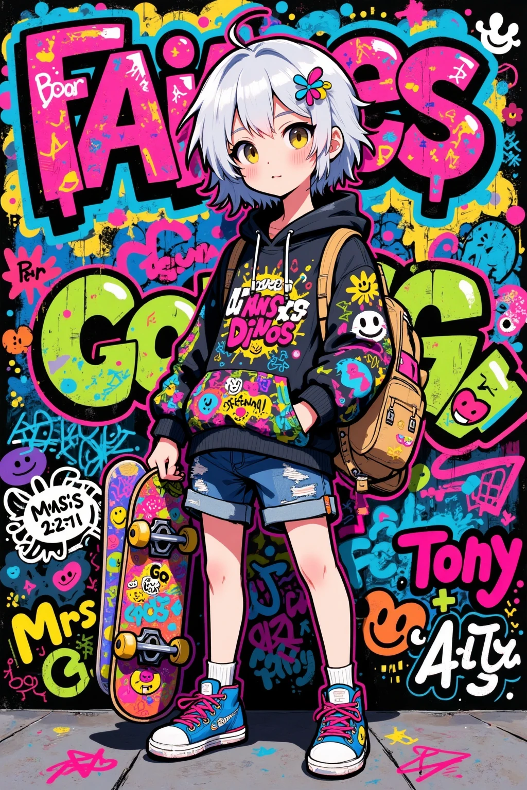Vibrant graffiti - style anime characters, girl in hoodie with colorful patterns, holding skateboard, graffiti - filled background, bright colors.