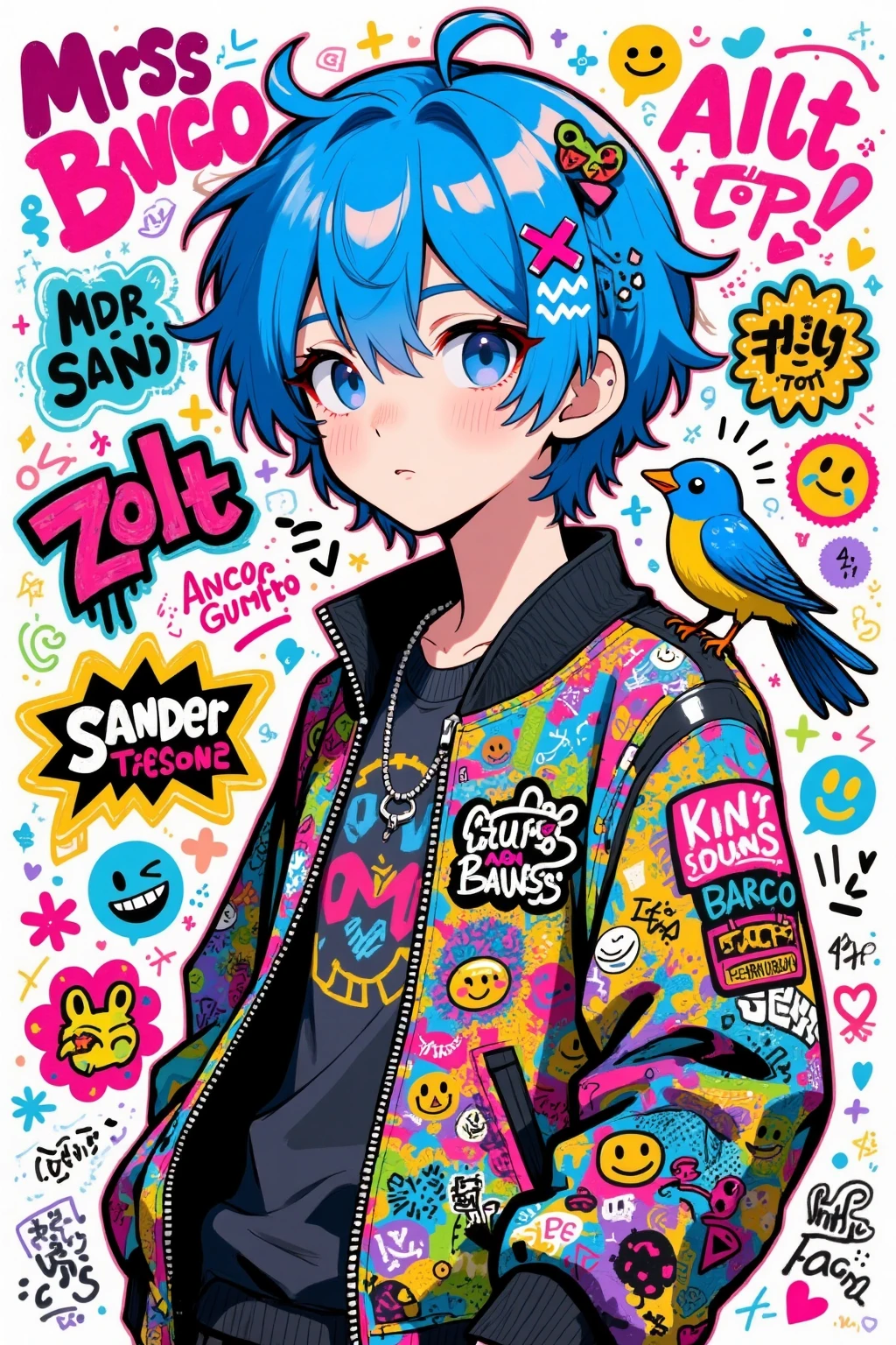 Vibrant graffiti - style anime characters, teen with blue hair, bird on shoulder, jacket with street art, playful stickers around.