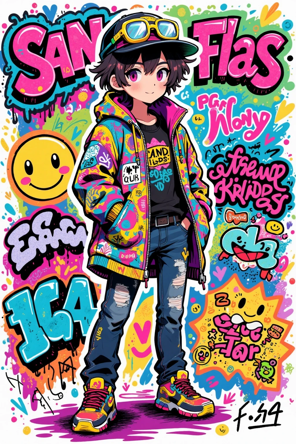 Vibrant graffiti - style anime characters, character in colorful coat, graffiti - inspired accessories, cheerful smiley icons, vivid scene.