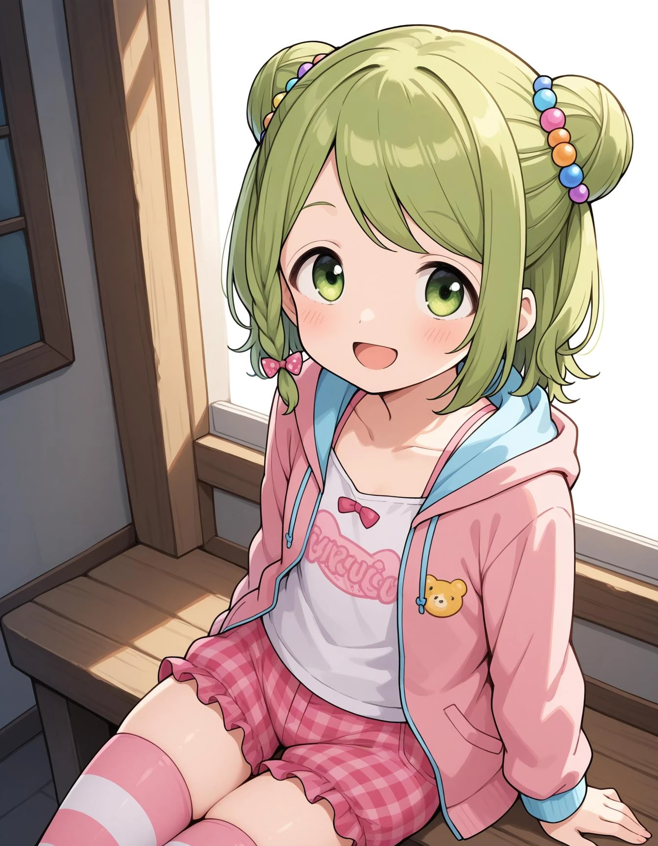 nijikazaki10cos,white shirt,bra strap,hoodie jacket,pink jacket,open jacket,bow ornament,ornament trimmed jacket,pink bow,polka dots bow,blue hood,hood down,pink shorts,frilled shorts,plaid shorts,striped thighhigh,pink thighhigh,