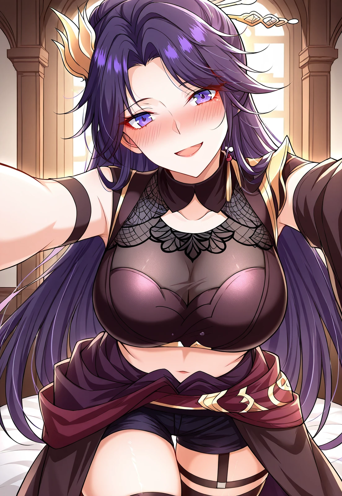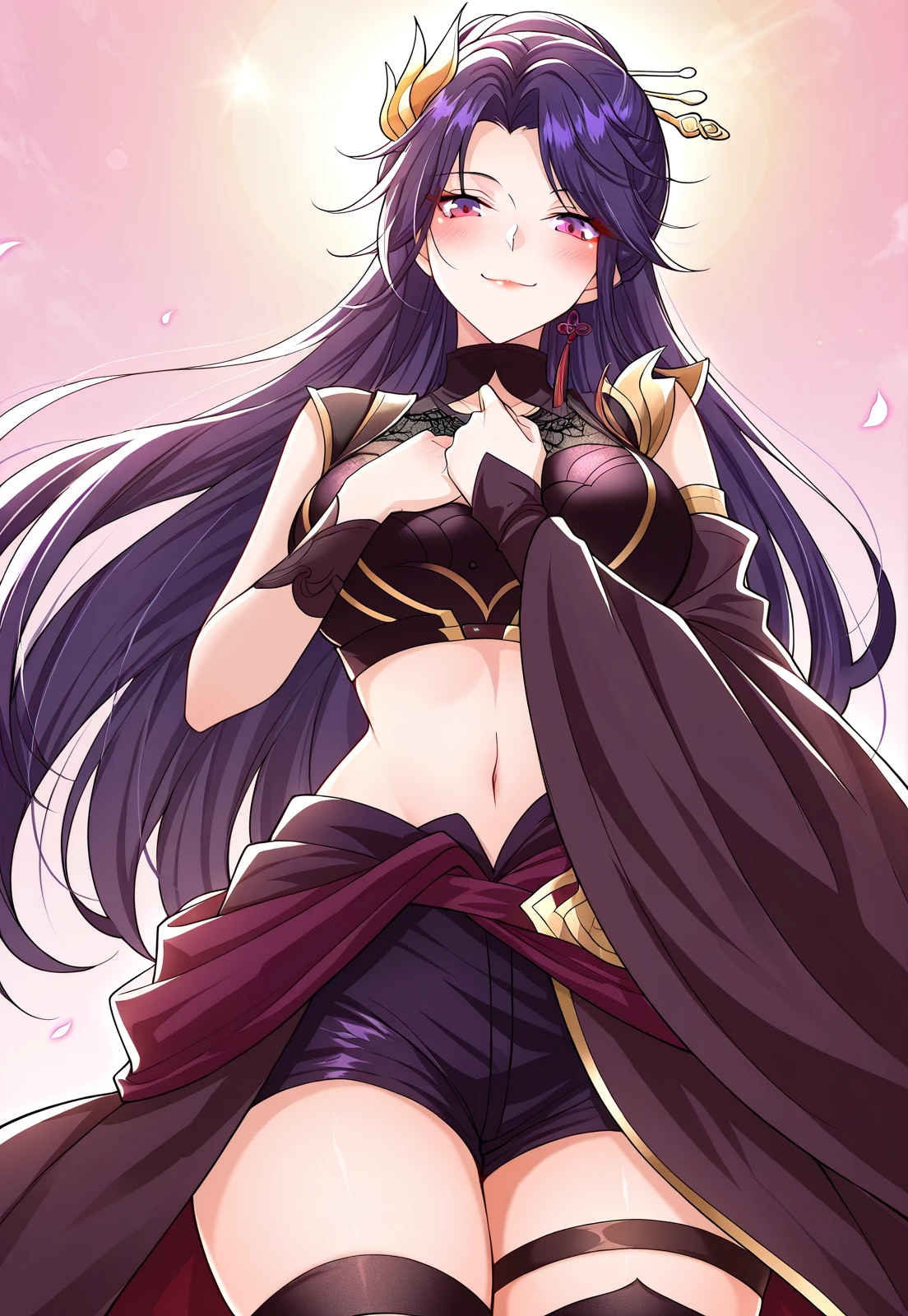 chinese outfit, black and gold outfit, mesh chest panel, sleeveless top, detached sleeves, midriff, asymmetrical skirt, short shorts, tight-fitting top, single garter strap, black thigh-high stockings, gold-trimmed boots, horn-shaped accessory