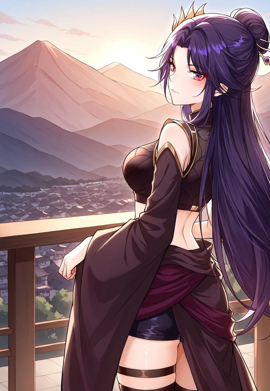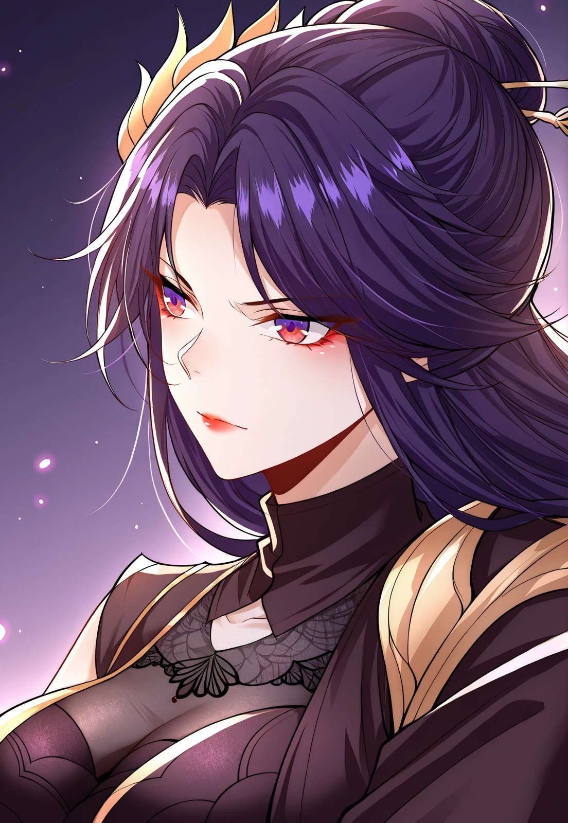 1 girl, solo, long hair, dark purple hair, violet hair, hair bun, side strands, red eyes, loose back hair, long bangs, golden hairpin,