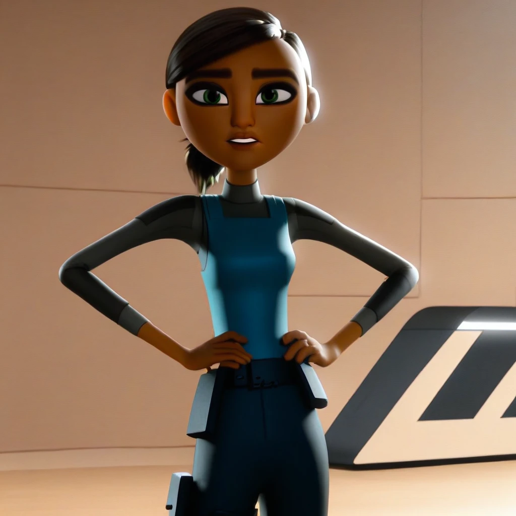 marcy_sid, dark skin, short hair, brown hair, ponytail, bulletproof vest, long sleeves, belt, pants