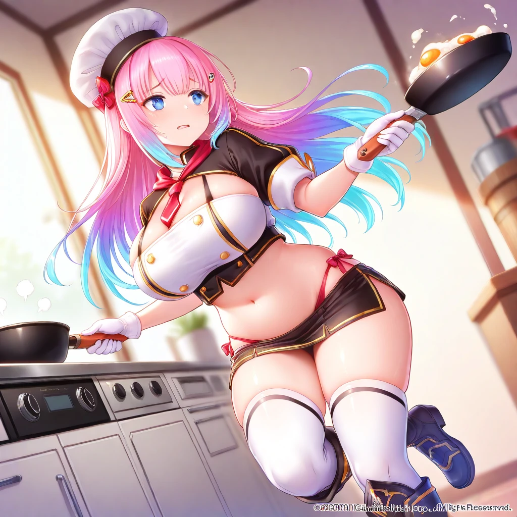 Chef outfit: Labchef, hairclip, chef hat, necktie, cleavage, crop top, navel, short white gloves, miniskirt, white thighhighs, knee boots,