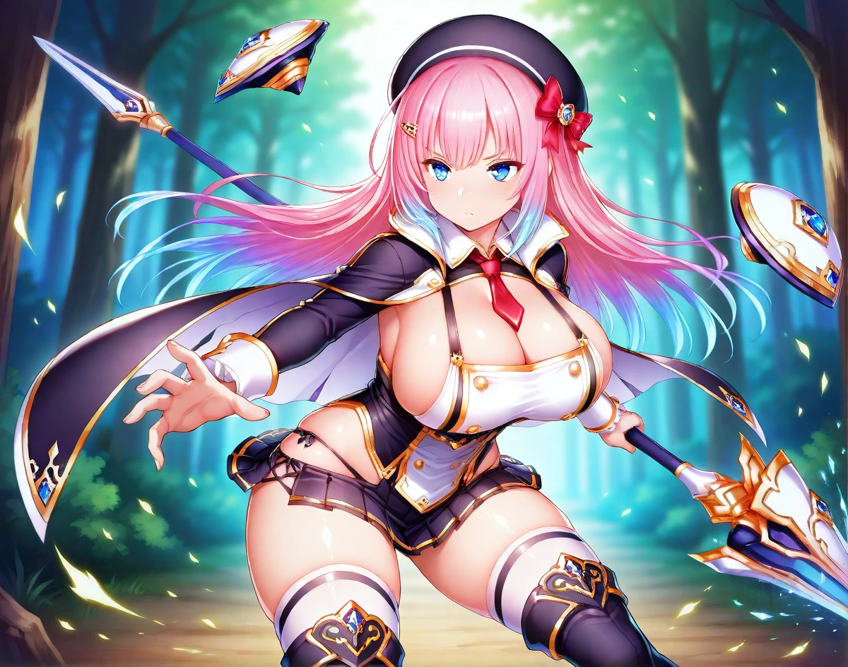 Base design: Labdef, hairclip, beret, hair ribbon, necktie, vest, cape, long sleeves, wrist cuffs, cleavage, sideboob, miniskirt, white thighhighs, thigh boots,