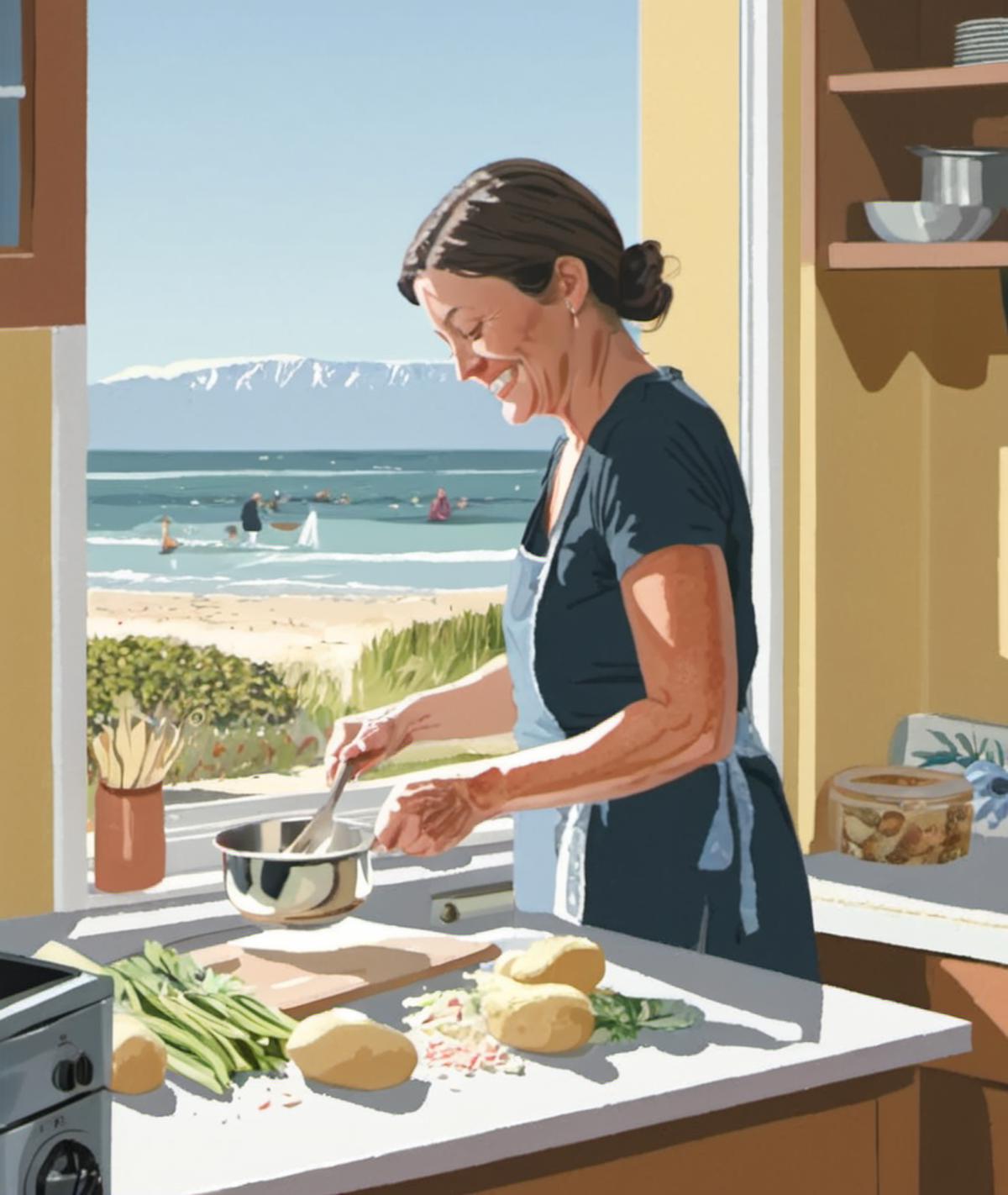 Style for generating art in the style of Terry Moyle & Rosie Louise. Works well for scenes of summer in New Zealand.