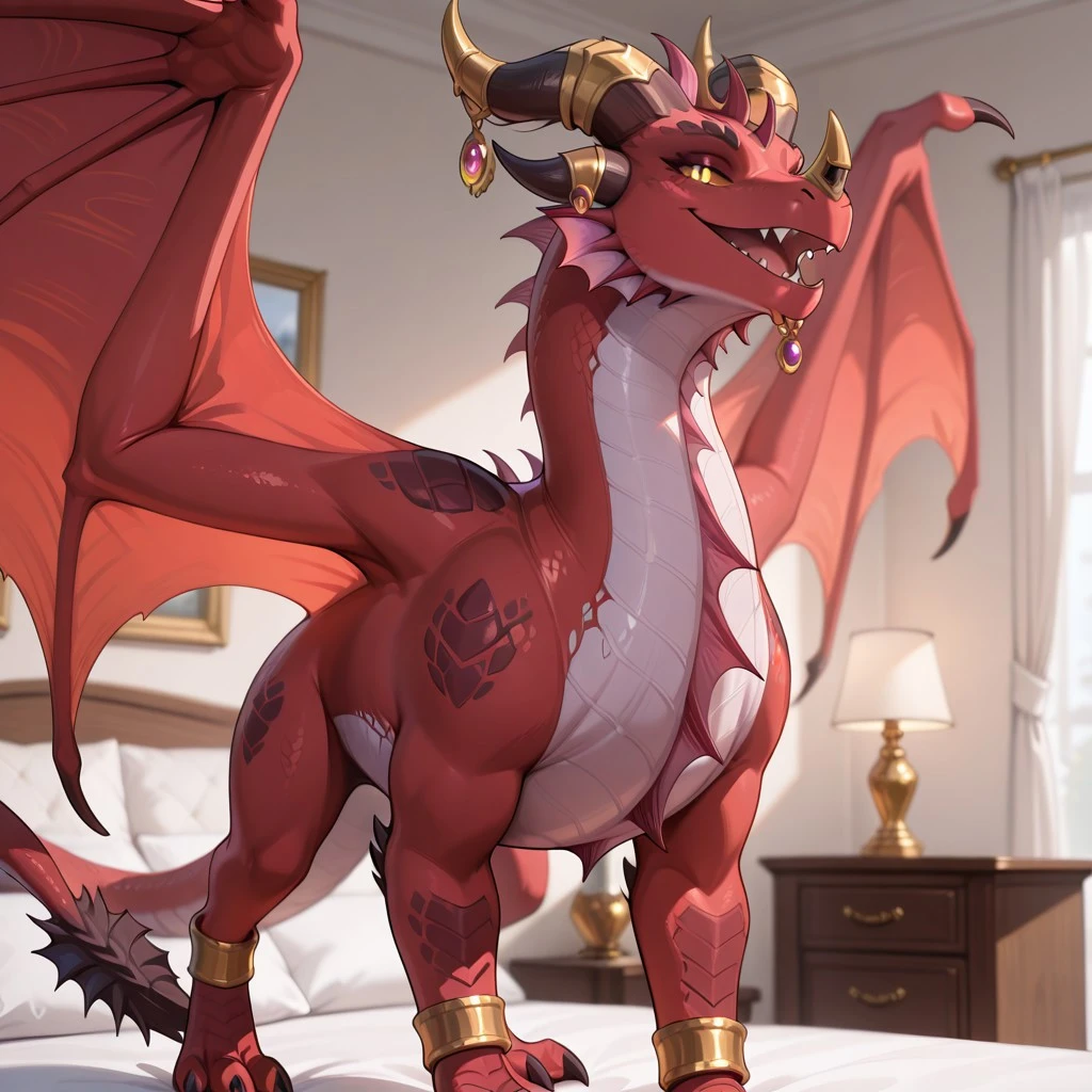 Additional prompts: dragon, red scales, chest frill, back spines, head frill, nose horn, gold horn ornaments, white underbelly, wings, horns, tail, tail end, claws, yellow sclera, black pupils, 1girl