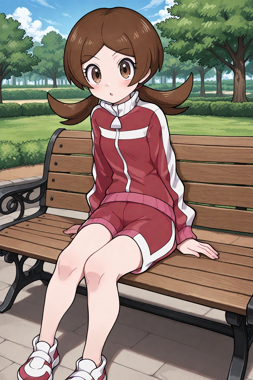 palyra, [lyra_\(pokemon\)], brown hair, brown eyes, low twintails, track jacket, red jacket, zipper pull tab, long sleevees, red shorts, shoes, red footwear, white footwear