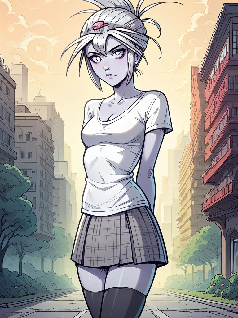 talia, hairclip, pale skin, t-shirt, small breasts, cleavage, plaid skirt, white thighhighs, black tall boots