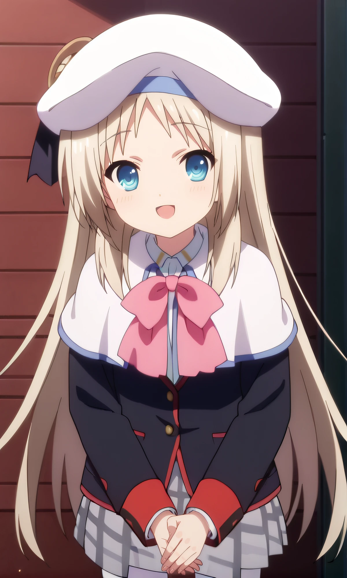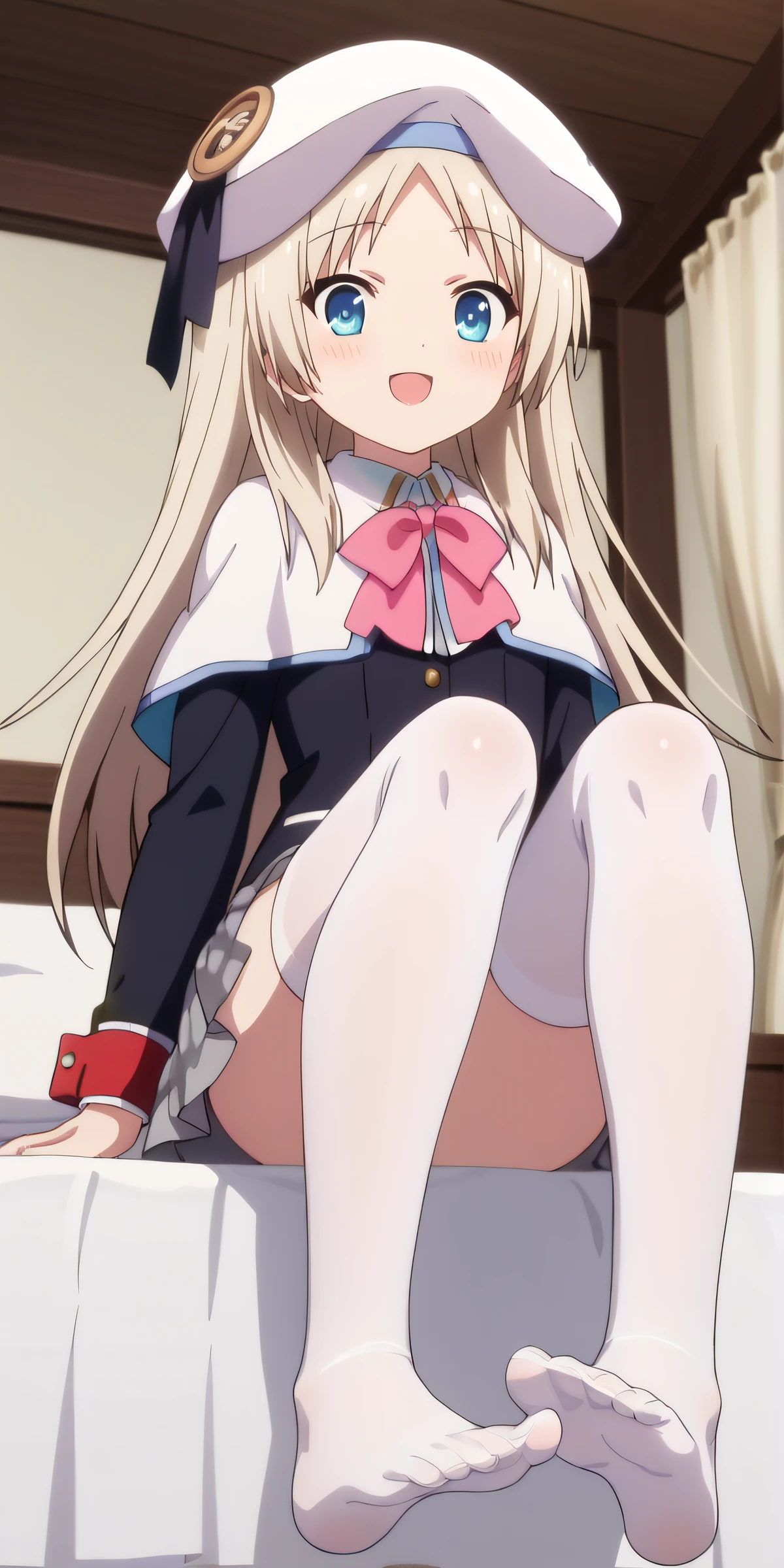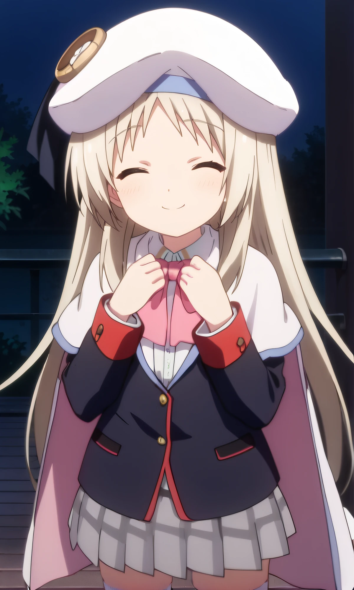 white hat, white cape, pink bowtie, black blazer, red cuffs, grey skirt, plaid skirt, white thighhighs