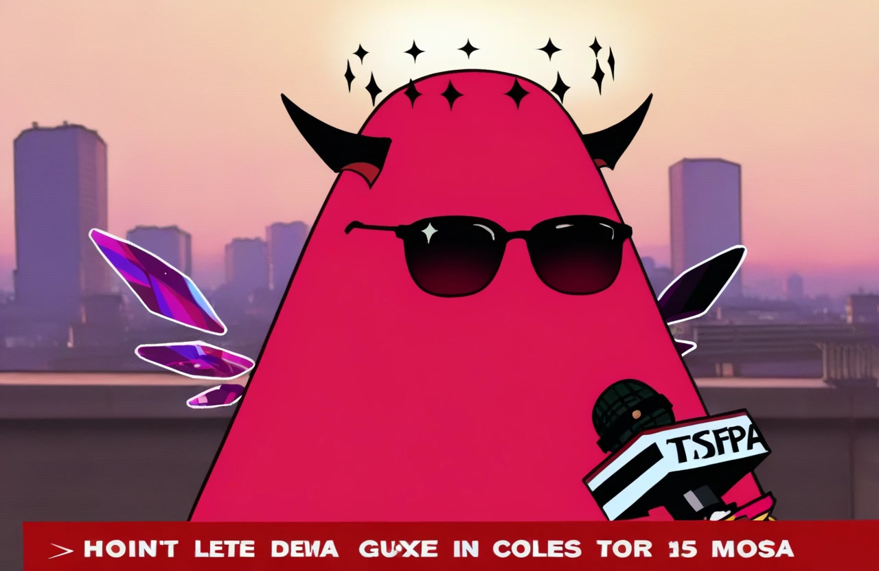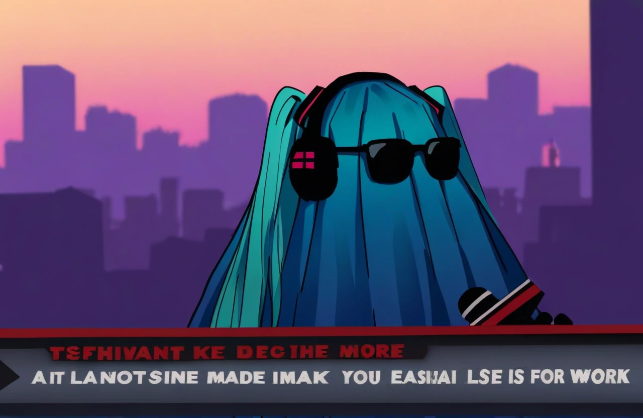 masterpiece, best quality, 1girl, <lora:tsfhibscistw-illus:1>, character and characteristics, tsfhibscistw, color ghost costume, sunglasses, holding microphone, english text, cityscape