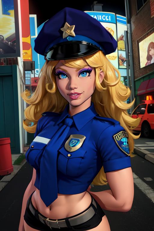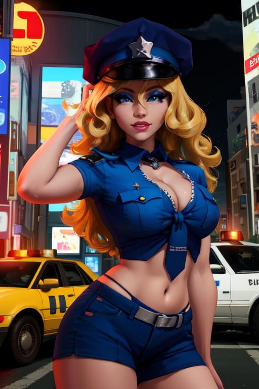 police uniform, police hat, midriff, black short shorts, blue shoes, blue tie,