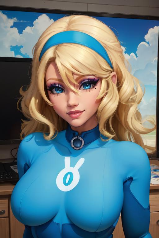 her 1st game attire was - blue body suit, white hairband, - may have a bunny tail,