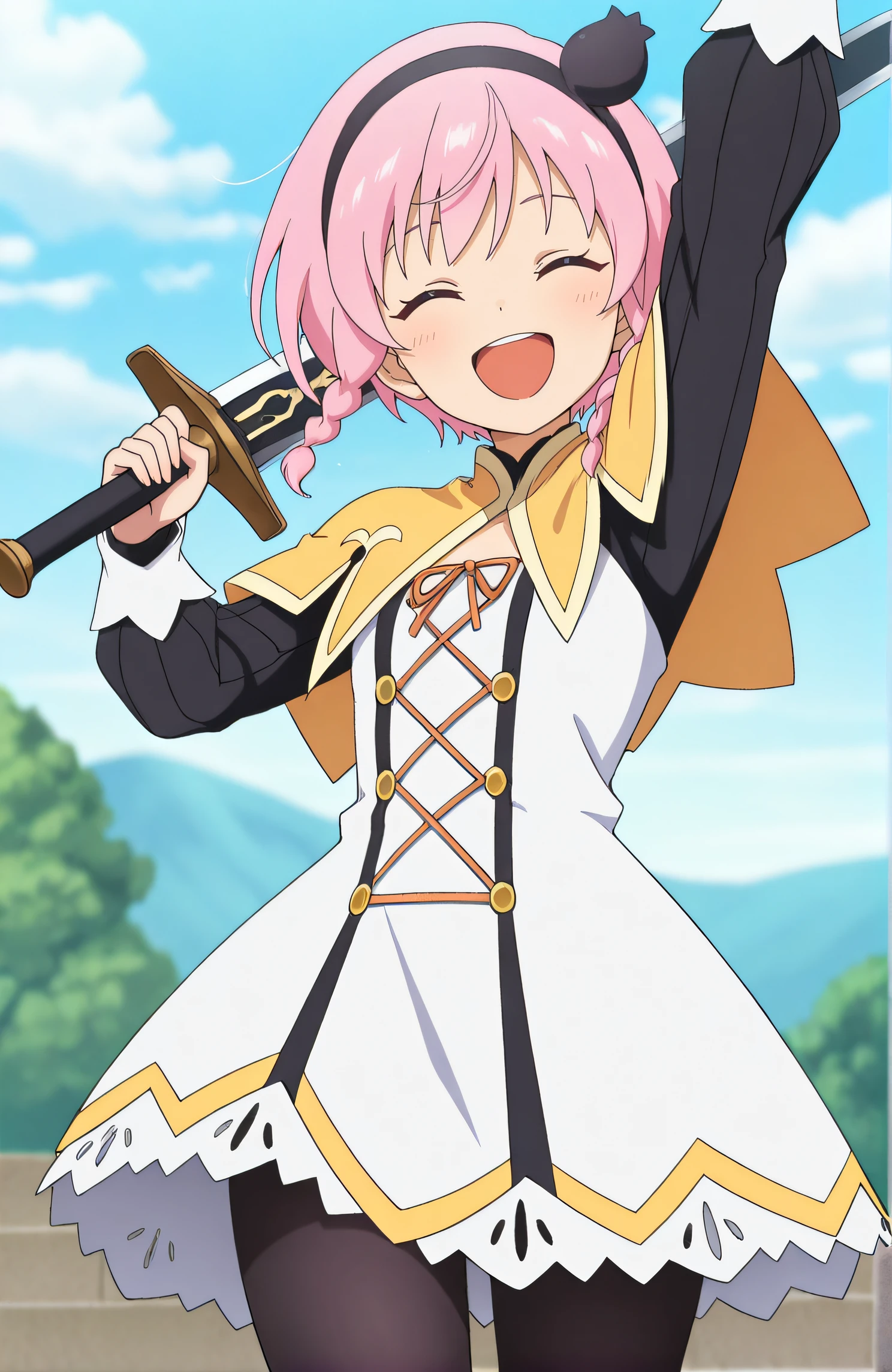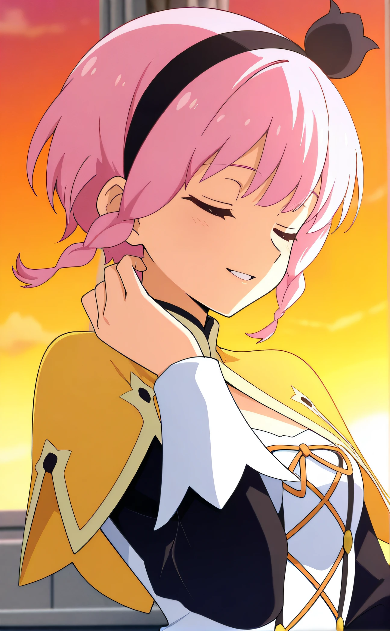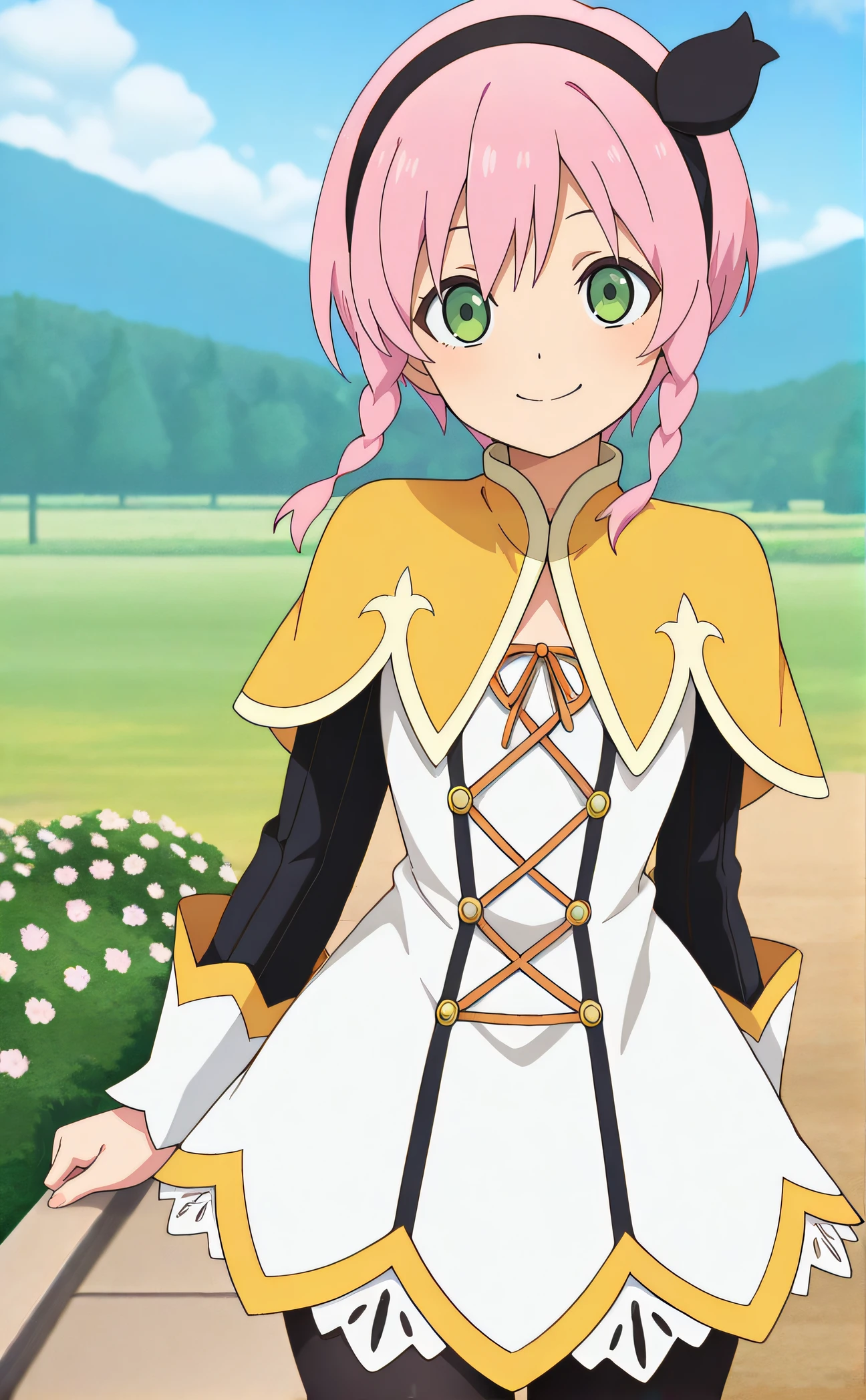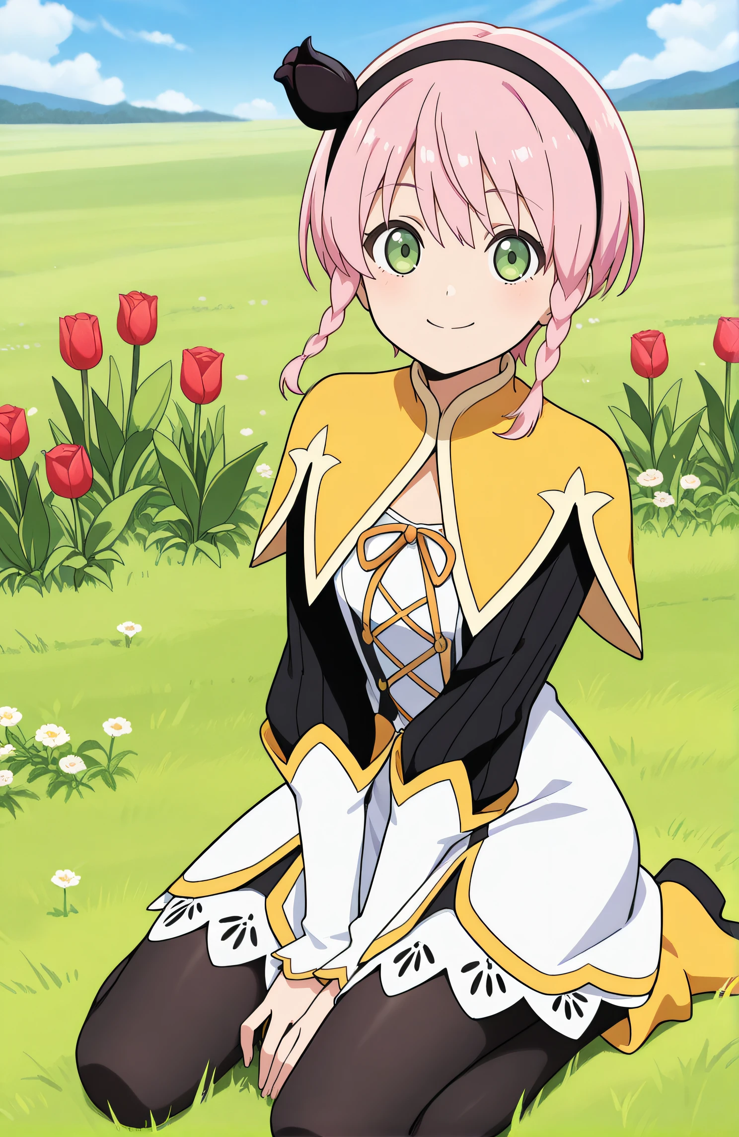 pasca, pink hair, closed eyes, very short hair, braids, black_hairband_with_flower, yellow capelet, white dress, black pantyhose, yellow shoes