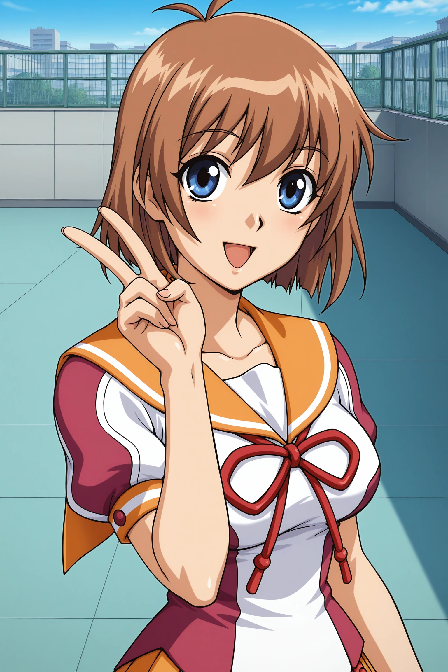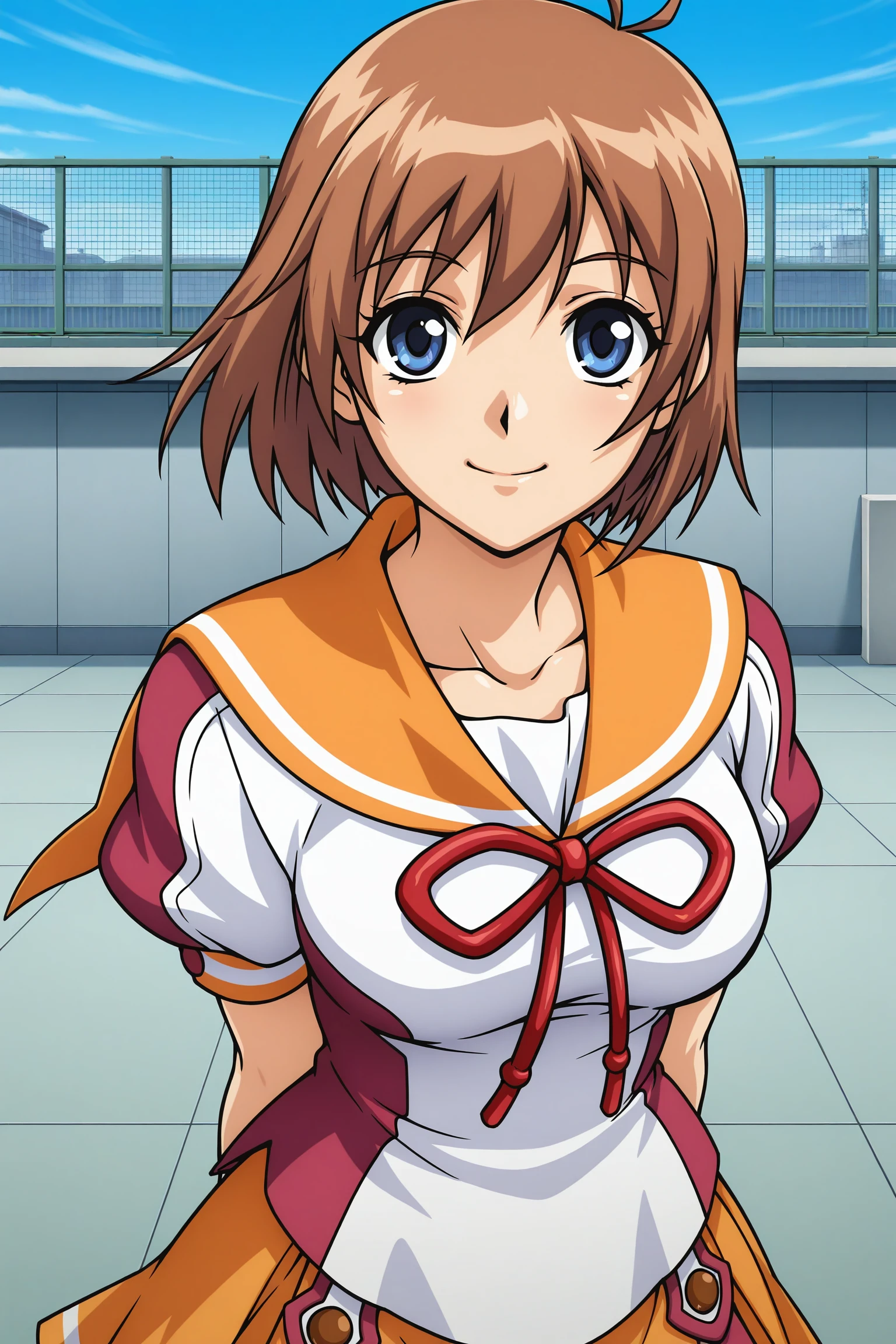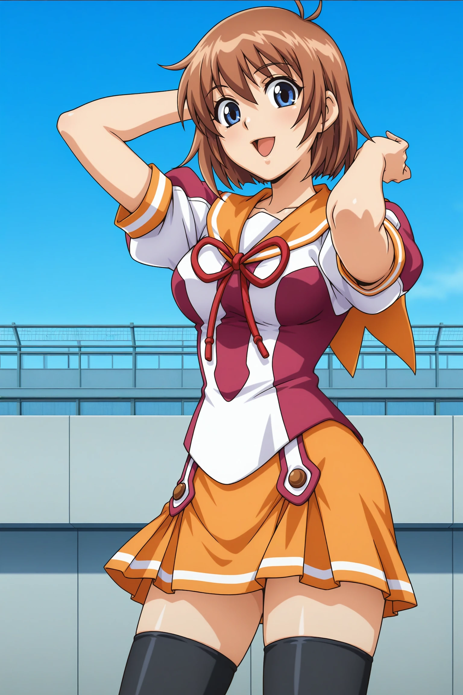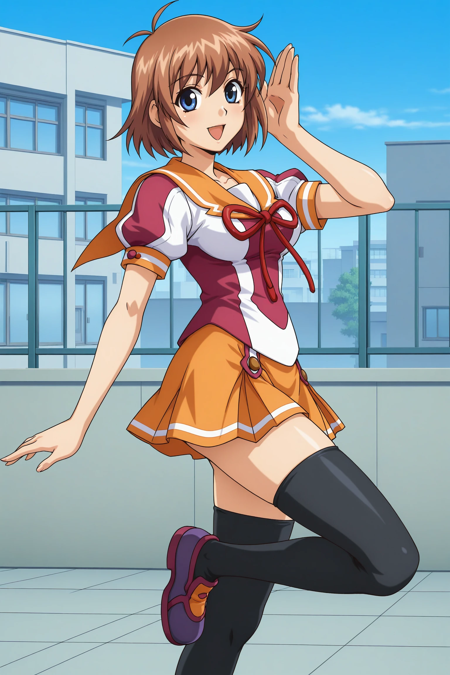 anna (yogurting), short hair, brown hair, blue eyes, school uniform, short sleeves, orange sailor collar, red bow, orange skirt, pleated skirt, black thighhighs, purple footwear
