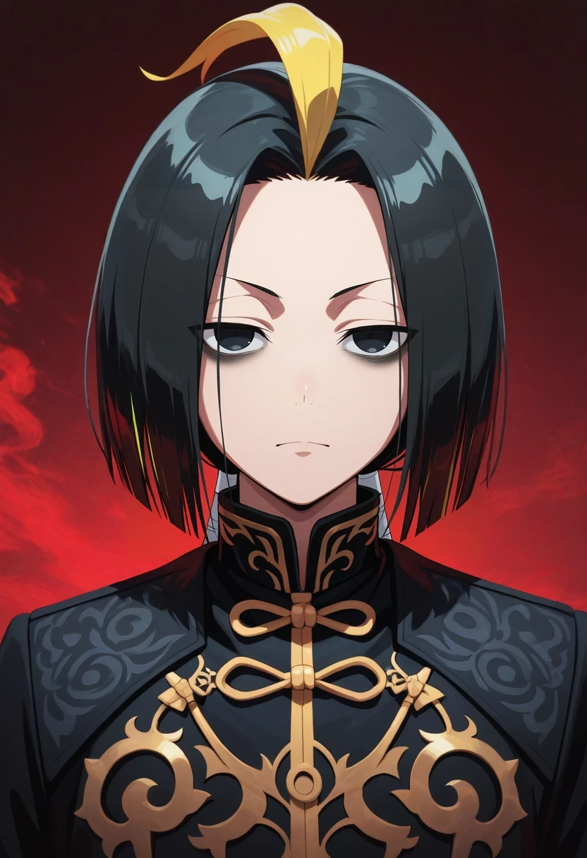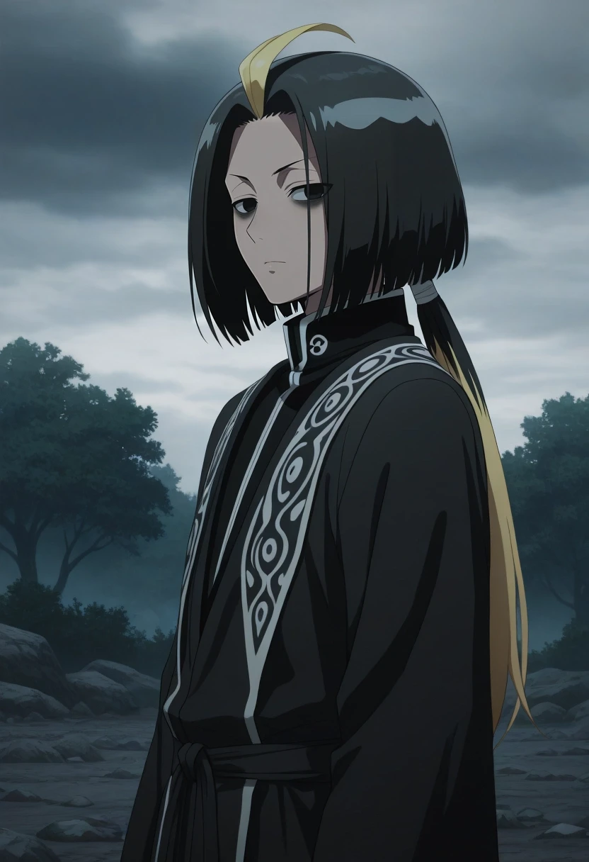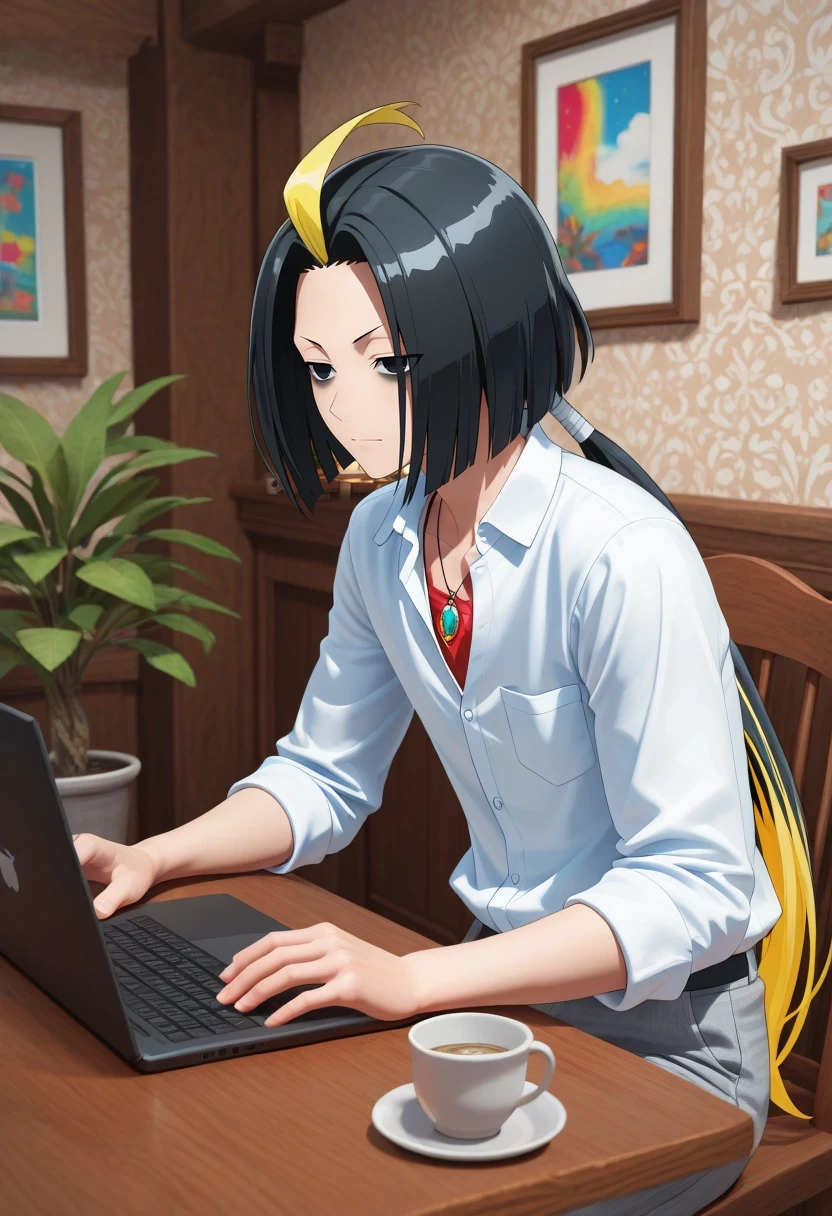 seigen_amawaka, black hair, black eyes, multicolored hair, two-tone hair, streaked hair, blonde hair, ahoge, long hair, low ponytail, hair tubes