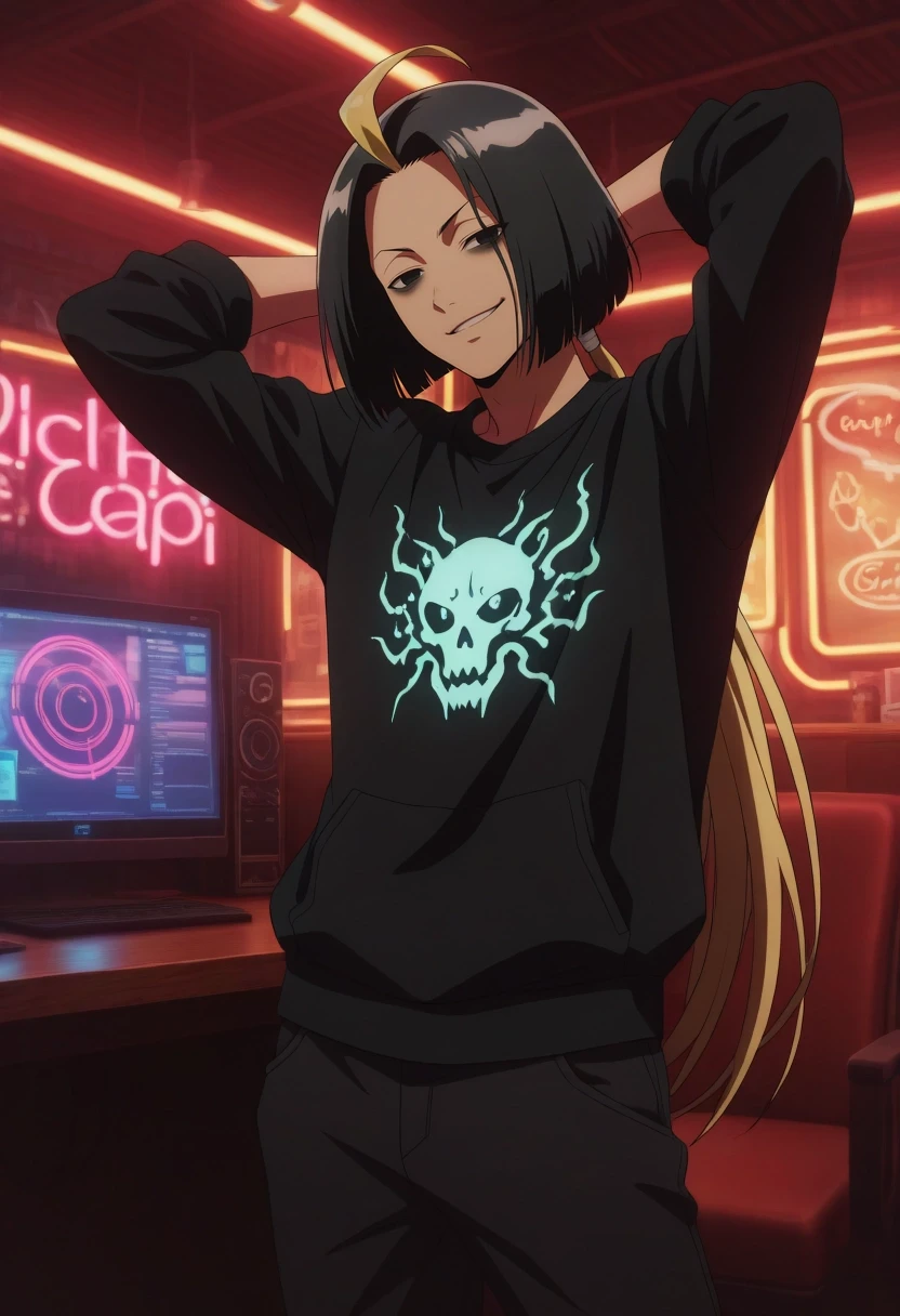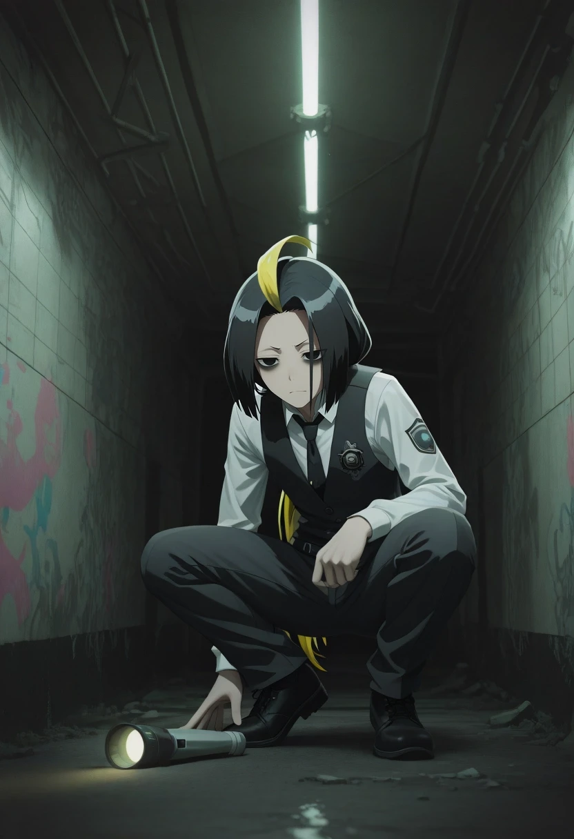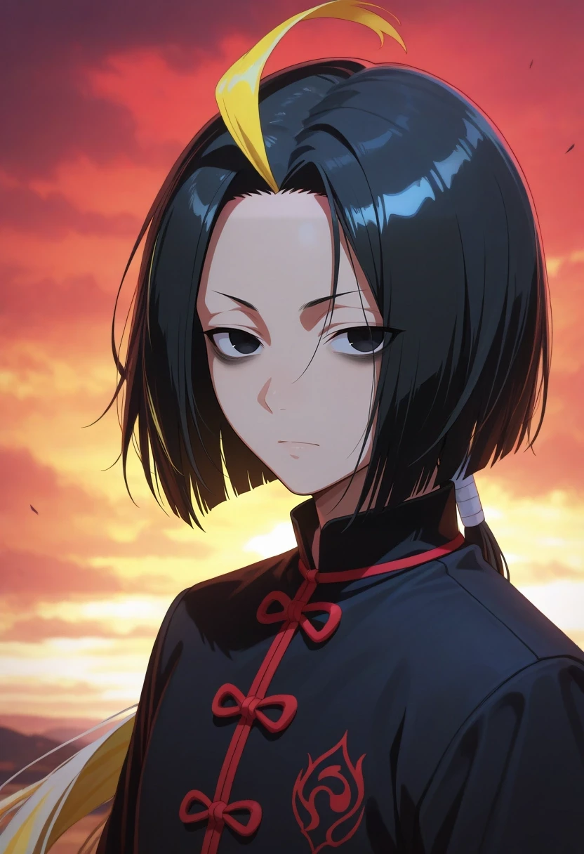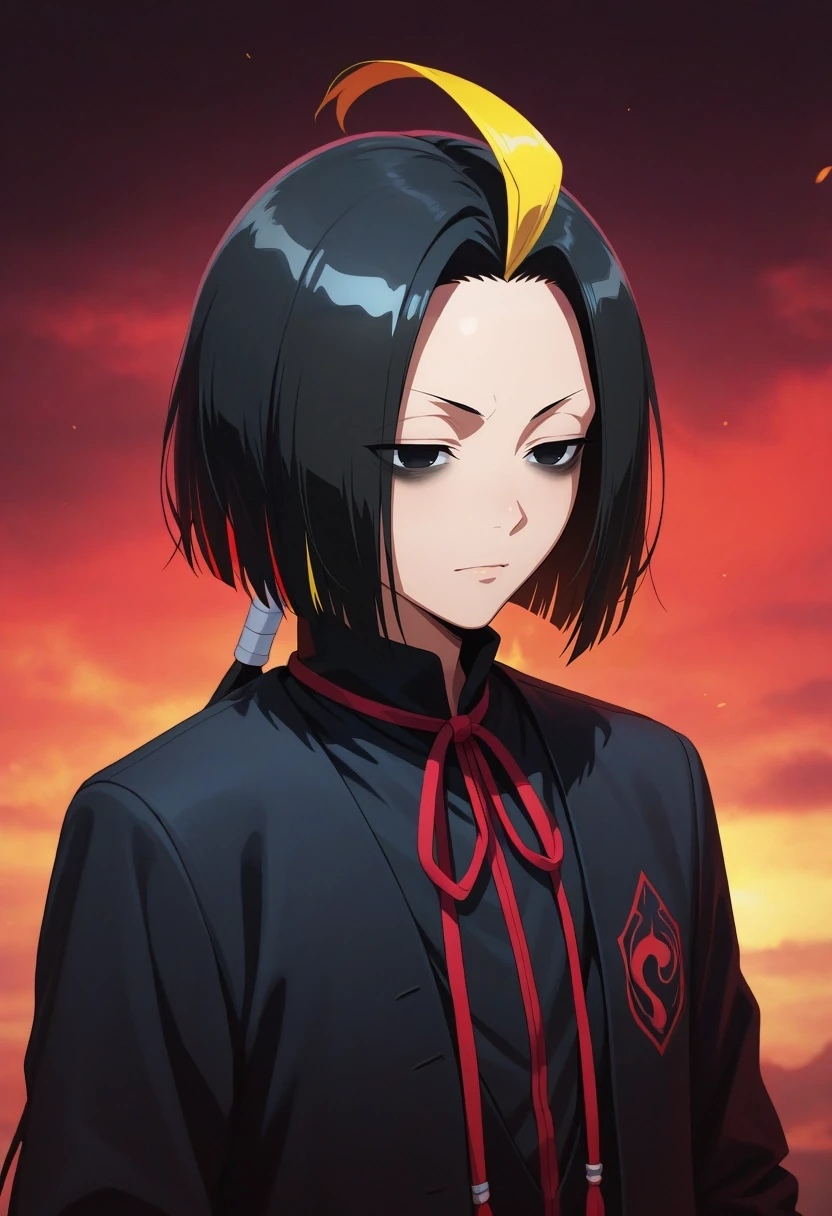 seigen_amawaka, black hair, black eyes, multicolored hair, two-tone hair, streaked hair, blonde hair, ahoge, long hair, low ponytail, hair tubes