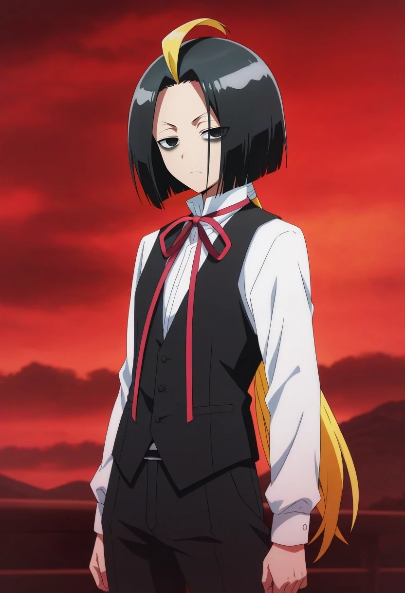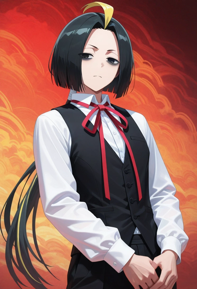 white shirt, collared shirt, long sleeves, black vest, red ribbon, red bowtie