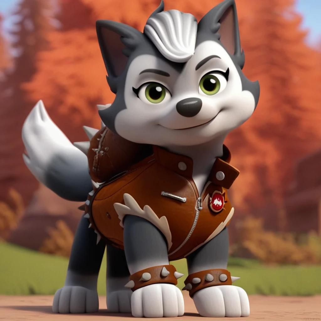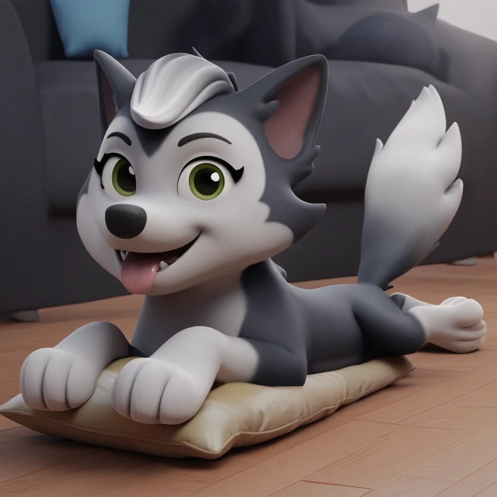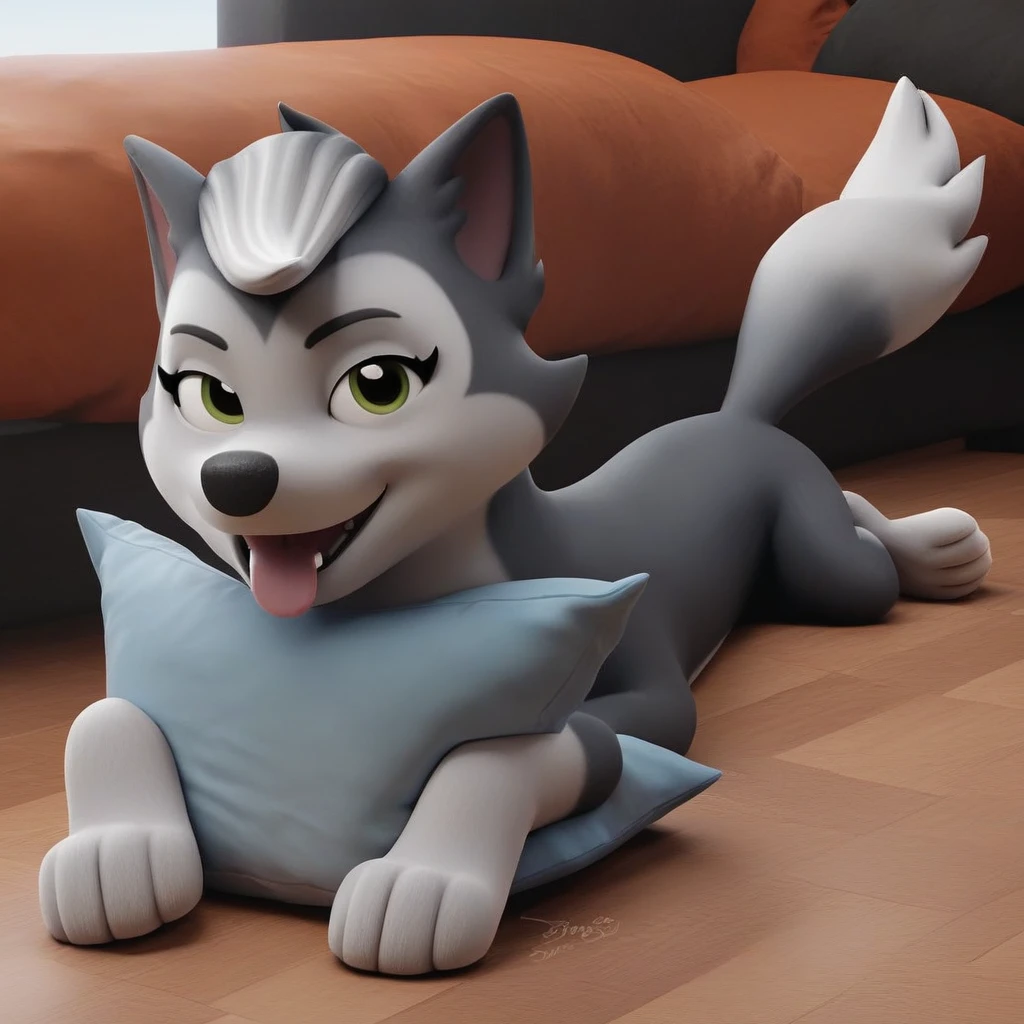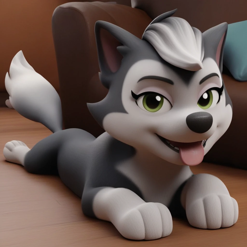 Dog, Siberian husky, gray and white fur, short hair, green eyes, fluffy tail,