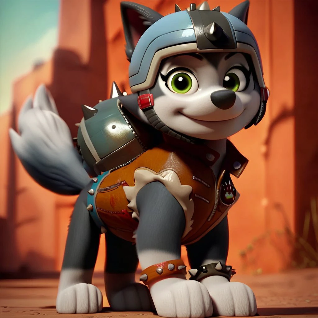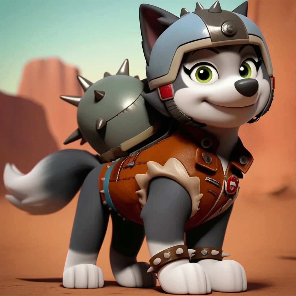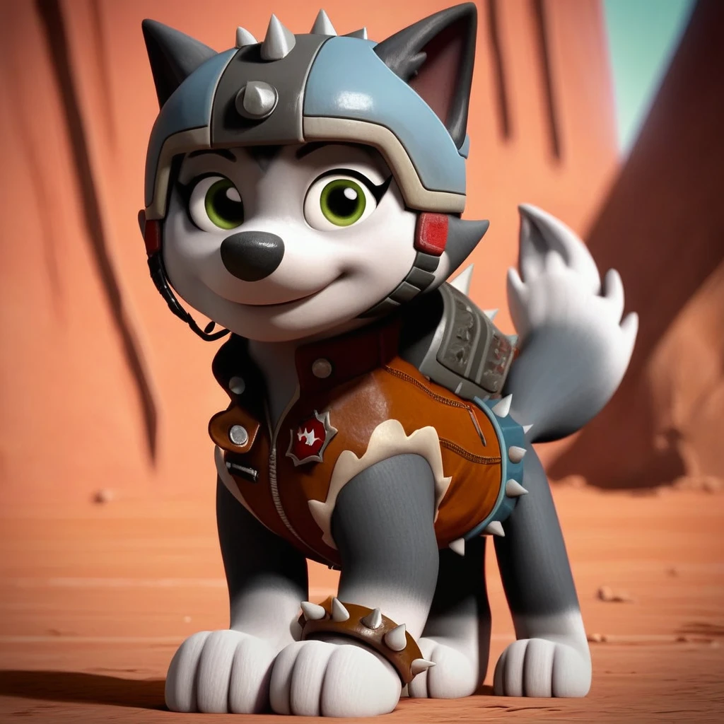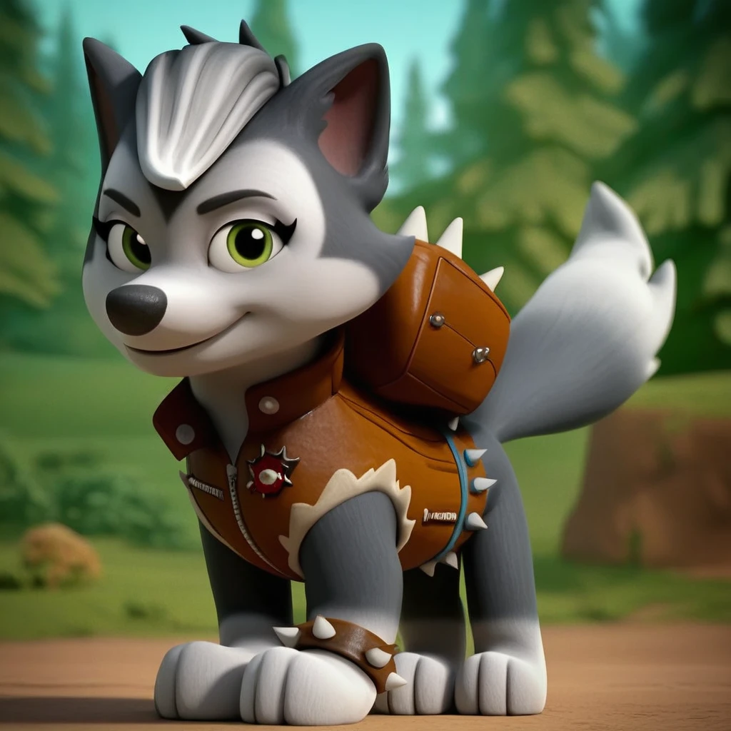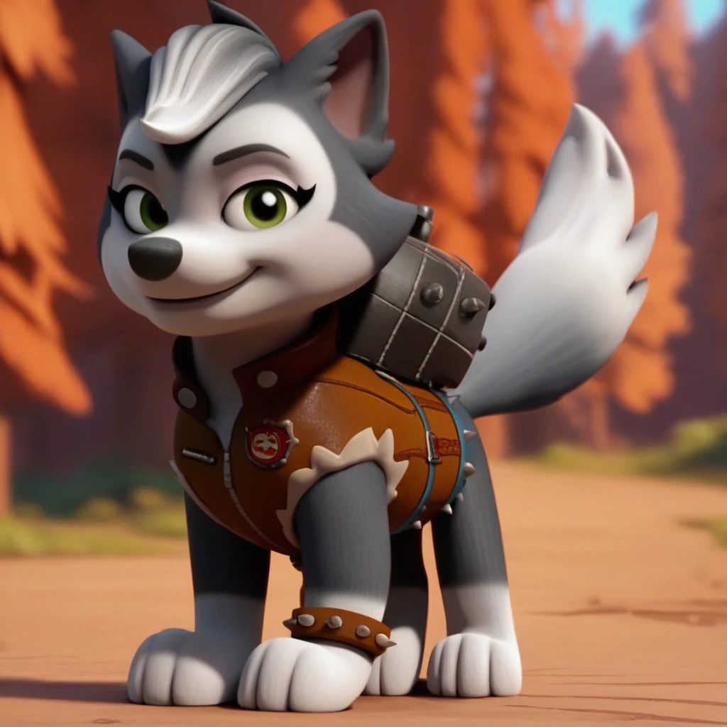 Dog, Siberian husky, gray and white fur, short hair, green eyes, fluffy tail,
