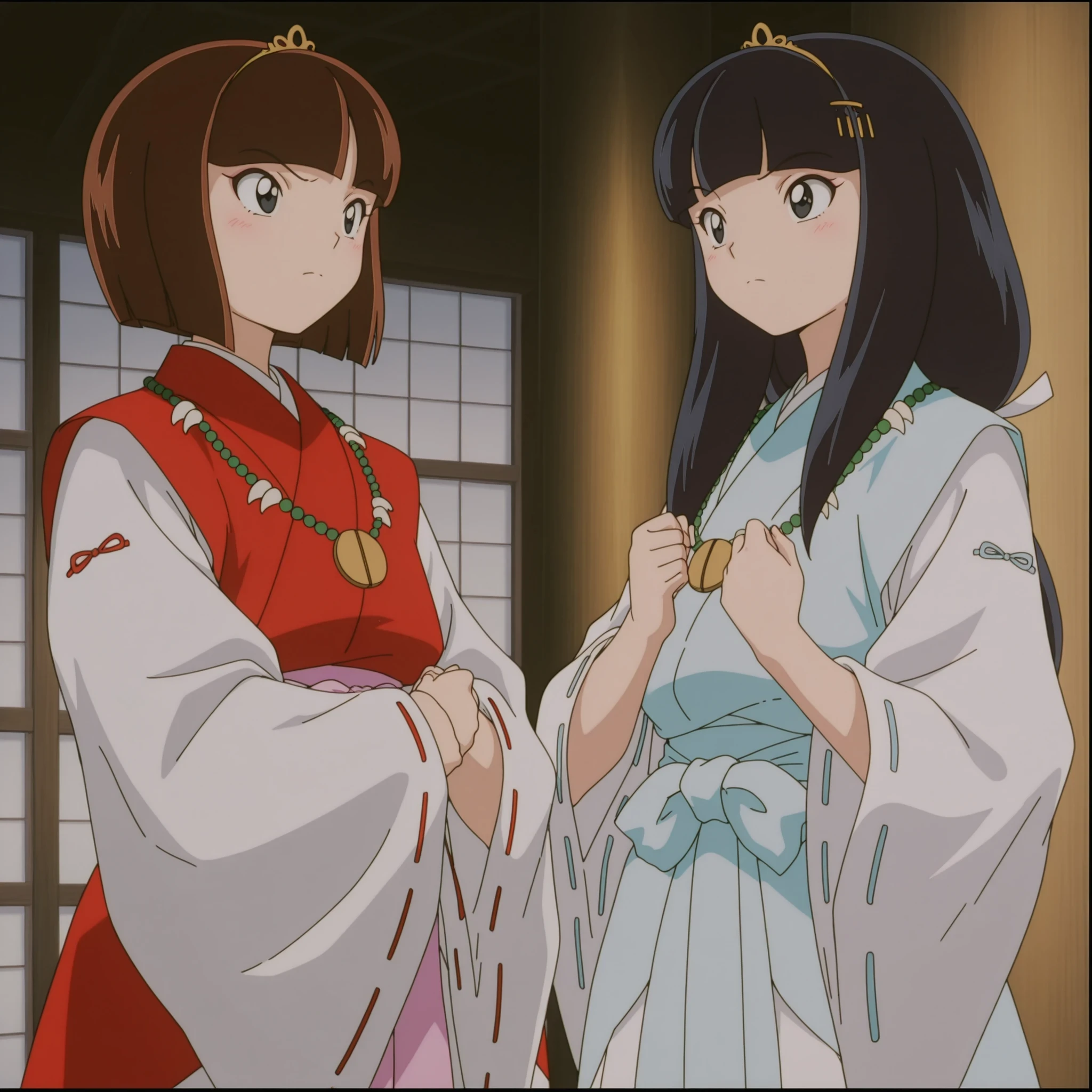 1girl, solo, Momiji, black eyes, brown hair, short hair, blunt_bangs, japanese_clothes, kimono, bob_cut, necklace, jewelry, tiara, retro_artstyle, anime Screencap