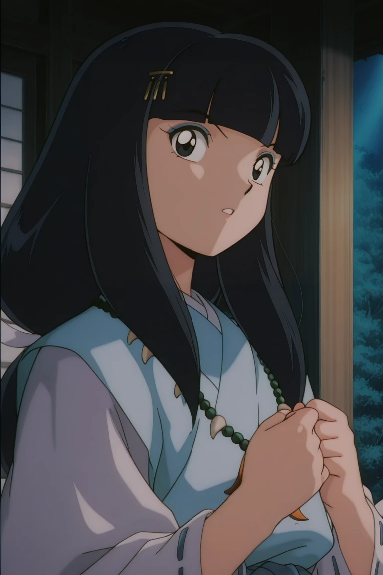 1girl, solo, Botan, black hair, long hair, black eyes, japanese_clothes, kimono, necklace, jewelry, retro_artstyle, anime Screencap