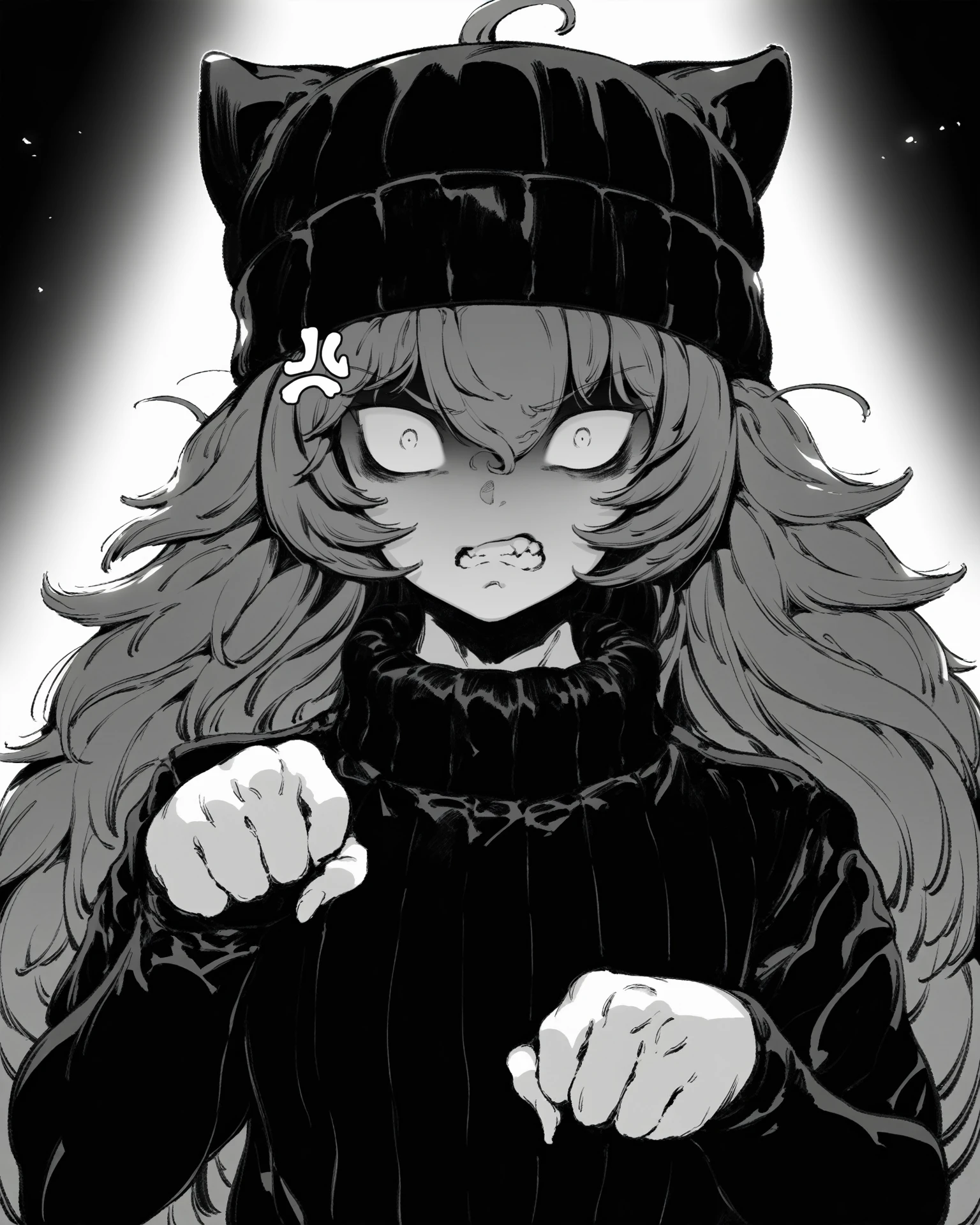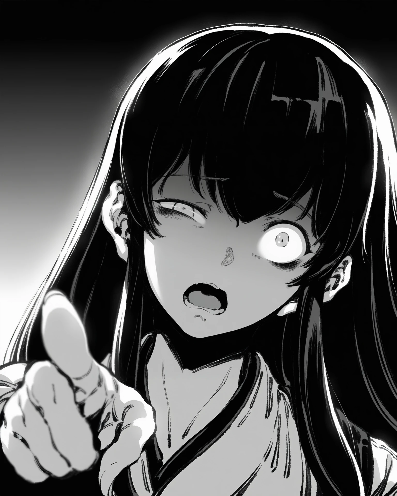 (dark hair)(light hair)因为这是一个黑白画风,我加入了这两个词以便能控制头发的实际绘画颜色。使用dark hair会使头发画成黑色并减小头发反光,而light hair会使头发画成灰色或白色并加大放光。这两个词也并非必要,不加头发颜色会倾向于你平时使用monochrome时的效果。