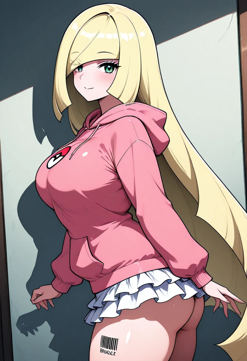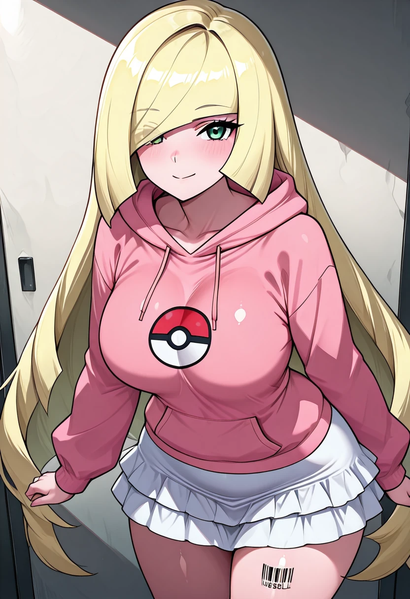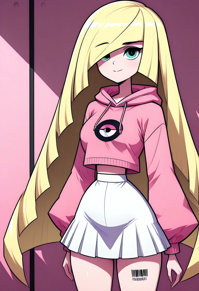 BbblC1tr0n, green eyes, blonde hair, long hair, blunt bangs, hair over one eye, barcode, pink hoodie, hood down, white skirt, long sleeves, thighs, miniskirt,