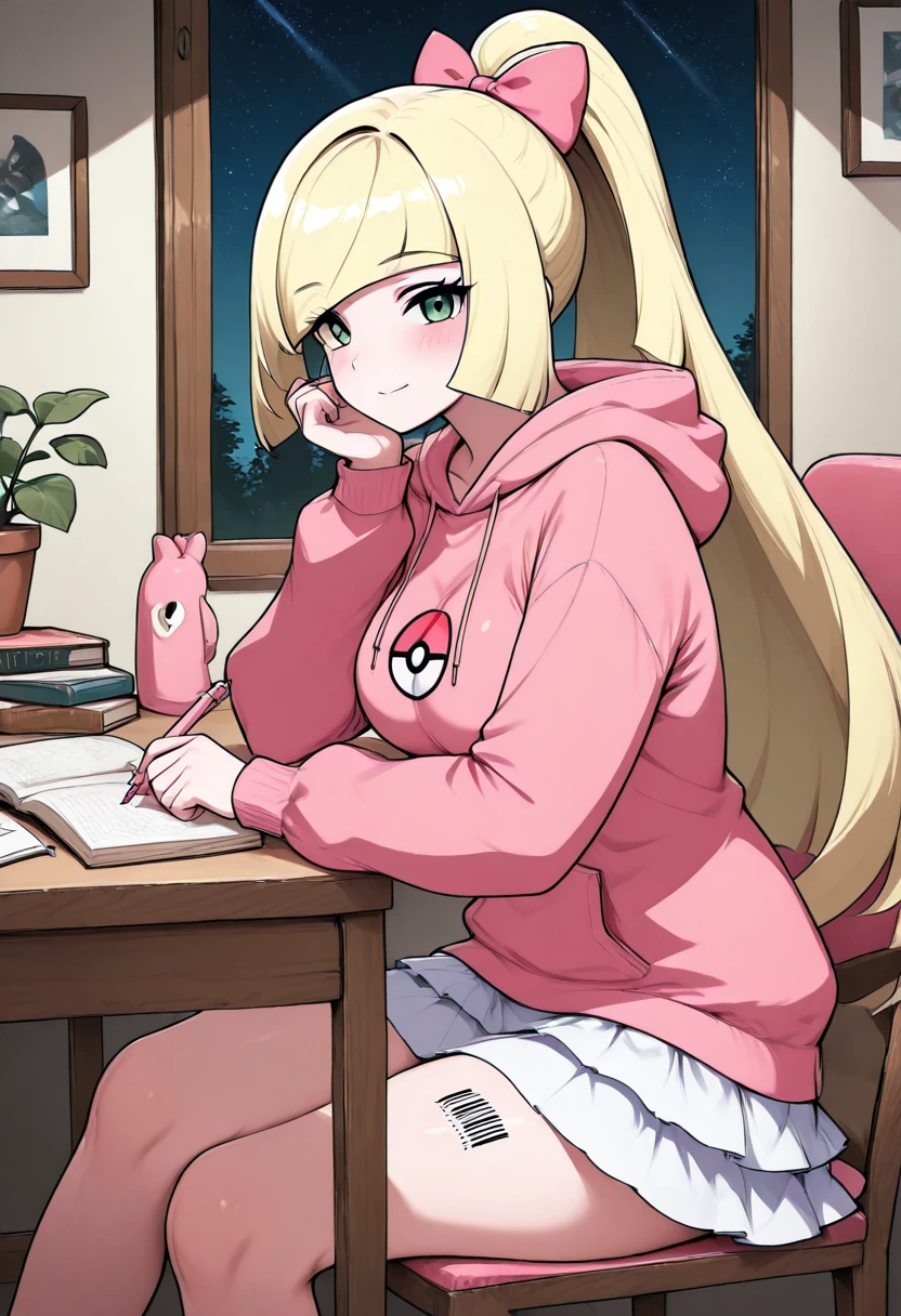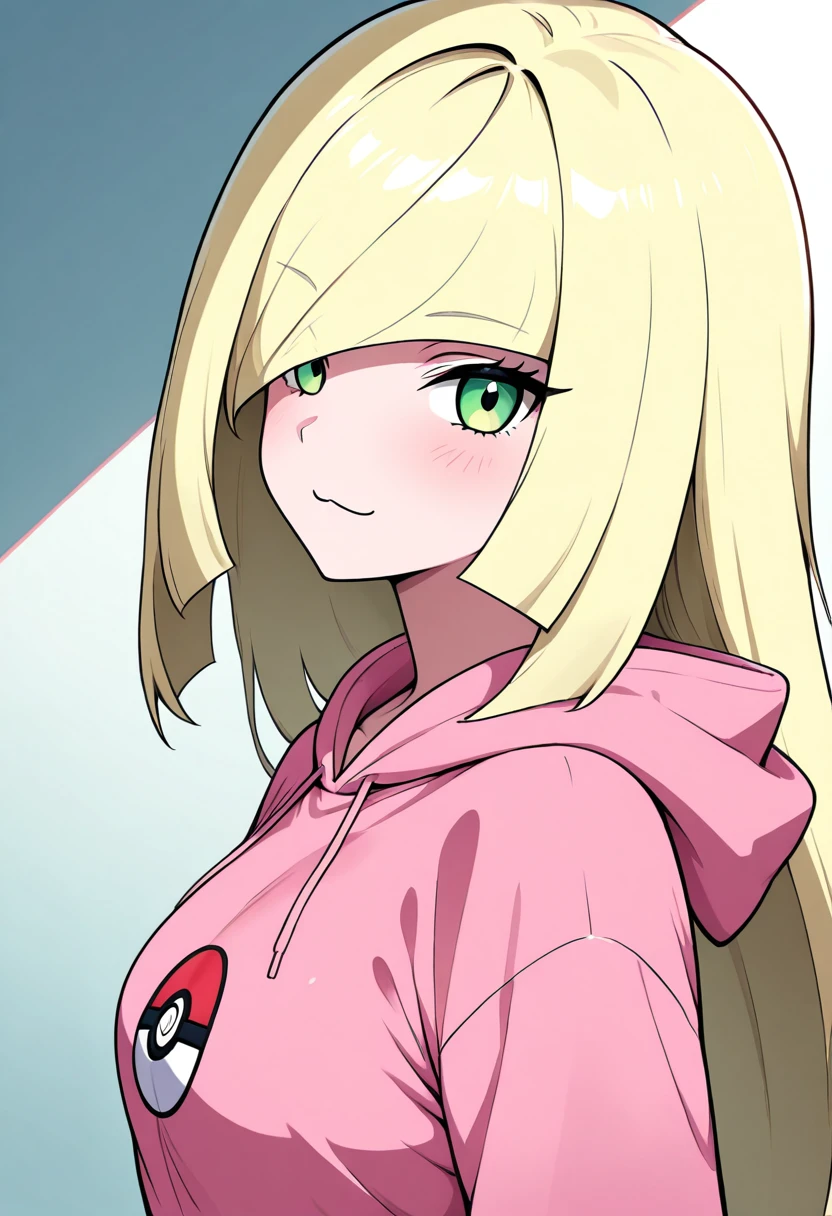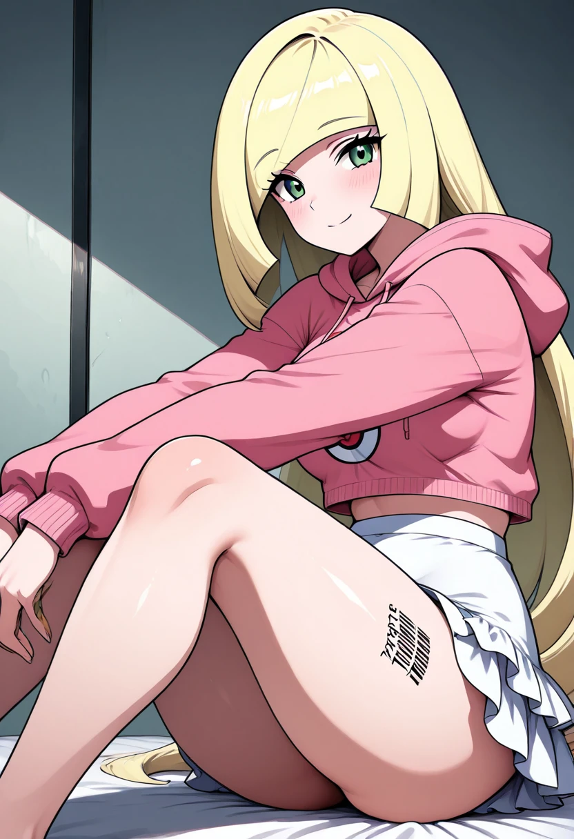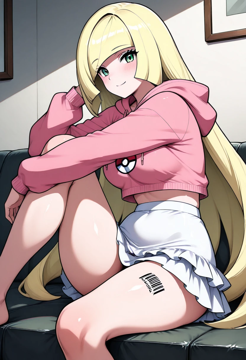 BbblC1tr0n, green eyes, blonde hair, long hair, blunt bangs, hair over one eye, barcode, pink hoodie, hood down, white skirt, long sleeves, thighs, miniskirt,
