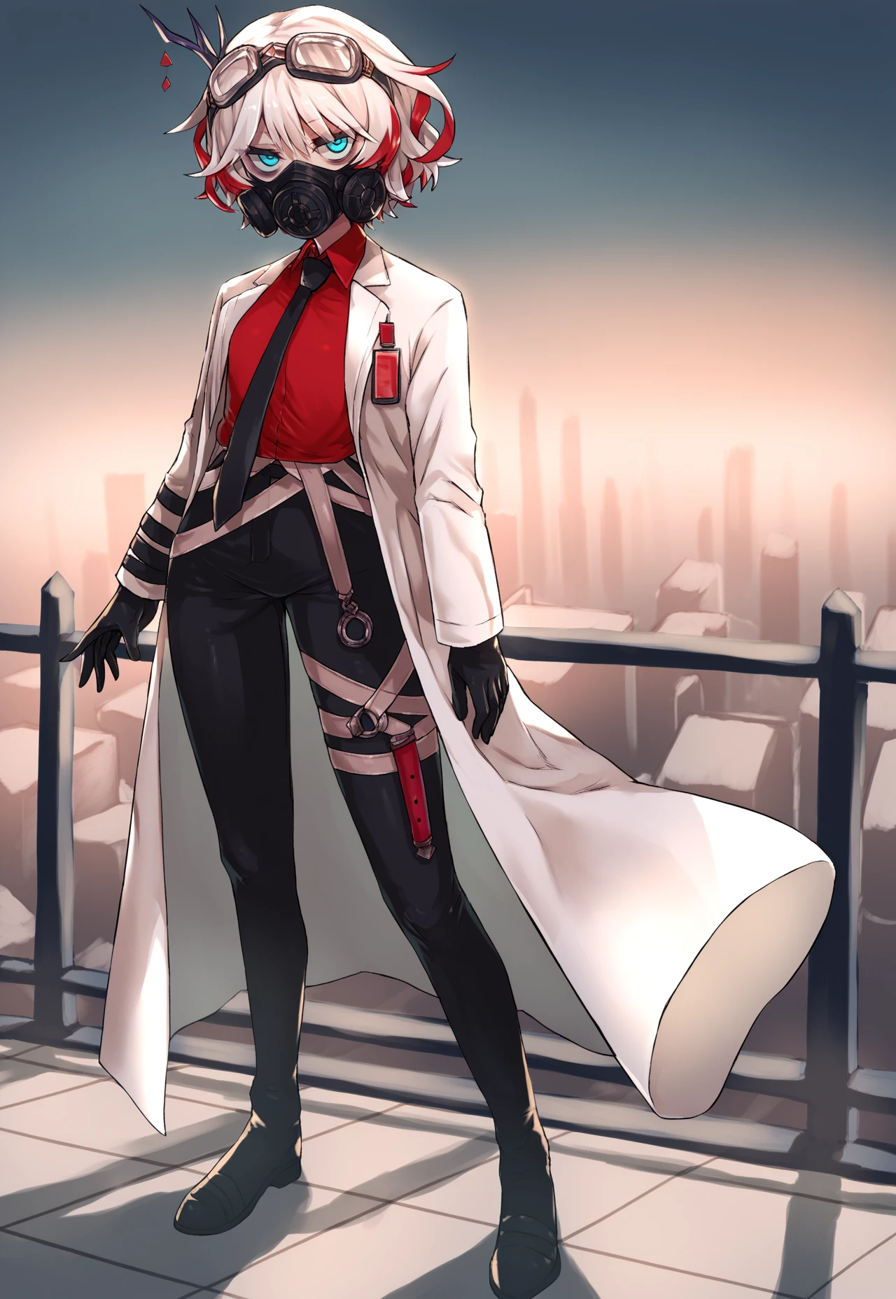 gloves, doctor, ((labcoat,)) multicolored hair, gas mask, shirt, goggles, mask, black gloves, streaked hair, white hair, necktie, black necktie, red shirt, long sleeves, goggles on head, short hair, collared shirt, bangs, respirator, two-tone hair, hair between eyes, hair ornament, blue eyes, aqua eyes, mouth mask, bags under eyes, jitome, pale skin, black pants, pants, belt, thigh strap, triangle-shaped pupils ,