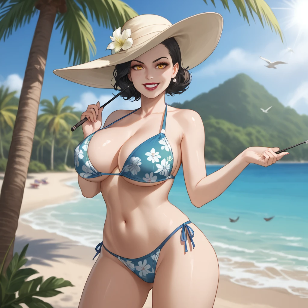 Trigger : LadyDimitrescu, 1girl, sun hat, white dress, pearl necklace, jewelry, black hair, black gloves, pale skin, breasts, smoking, long dress, tall female, short hair, flower, cleavage, earrings, cowboy shot