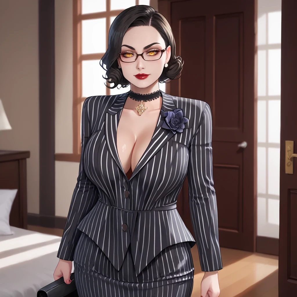 Trigger with claws: LadyDimitrescu, 1girl, large breasts, sun hat, white dress, cleavage, jewelry, yellow eyes, black hair, necklace, short hair, black gloves, makeup, lipstick, claws, rose, flower, tall female, pale skin, long dress, cowboy shot