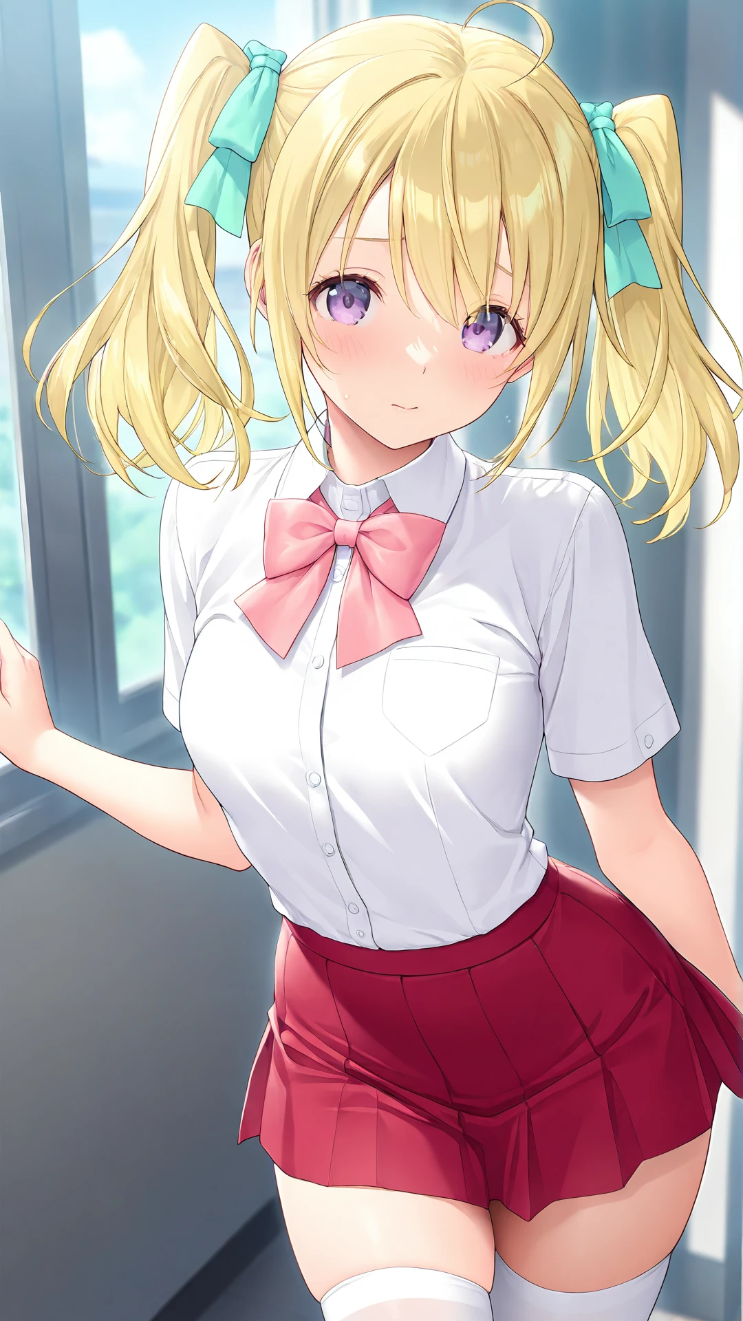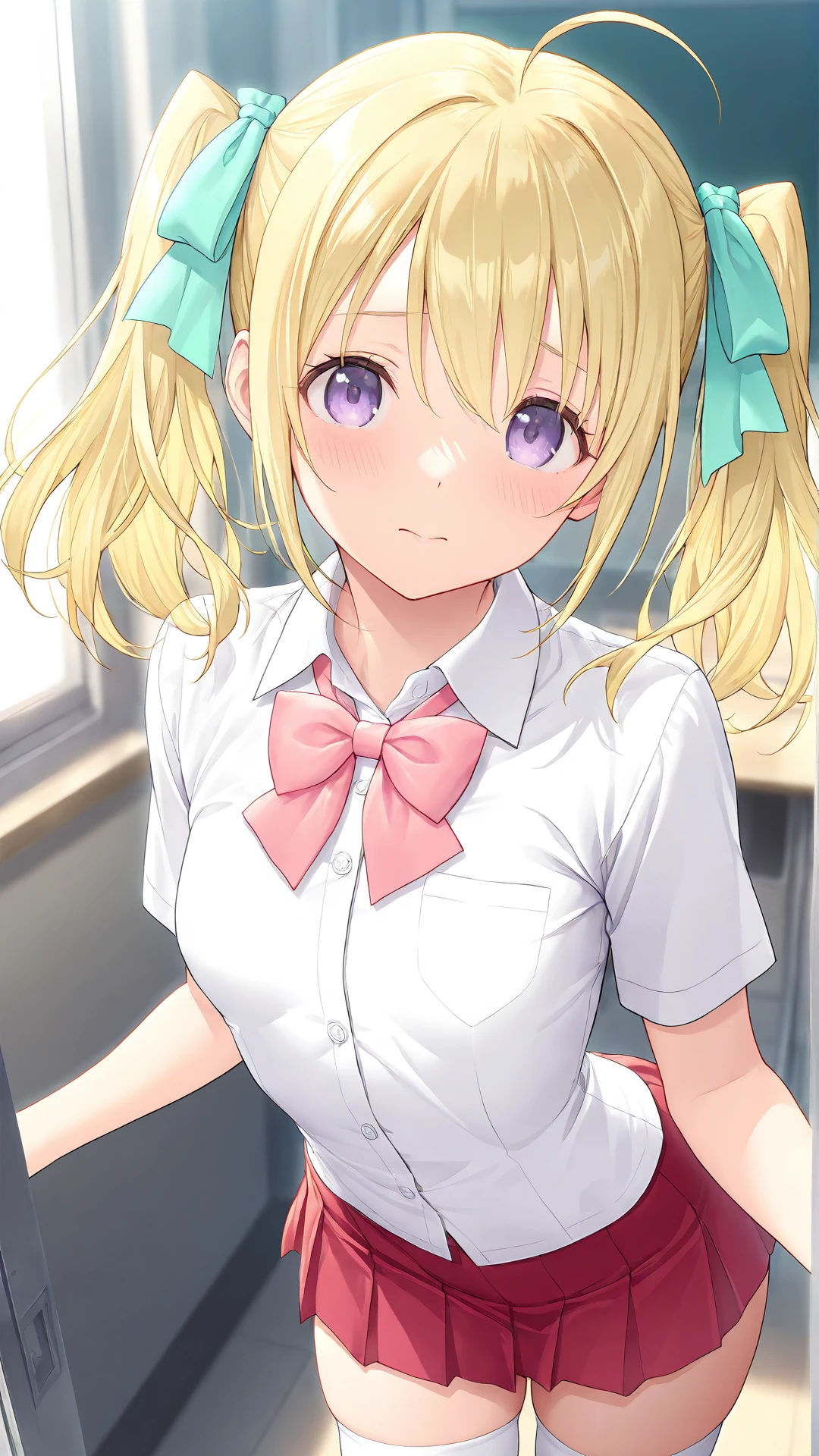 Kano Sakura,1girl,solo,blonde hair,twintails,ahoge,purple eyes,school uniform,shirt,short sleeves,skirt,red skirt,bow,bowtie,ribbon,hair ribbon,white thighhighs,
