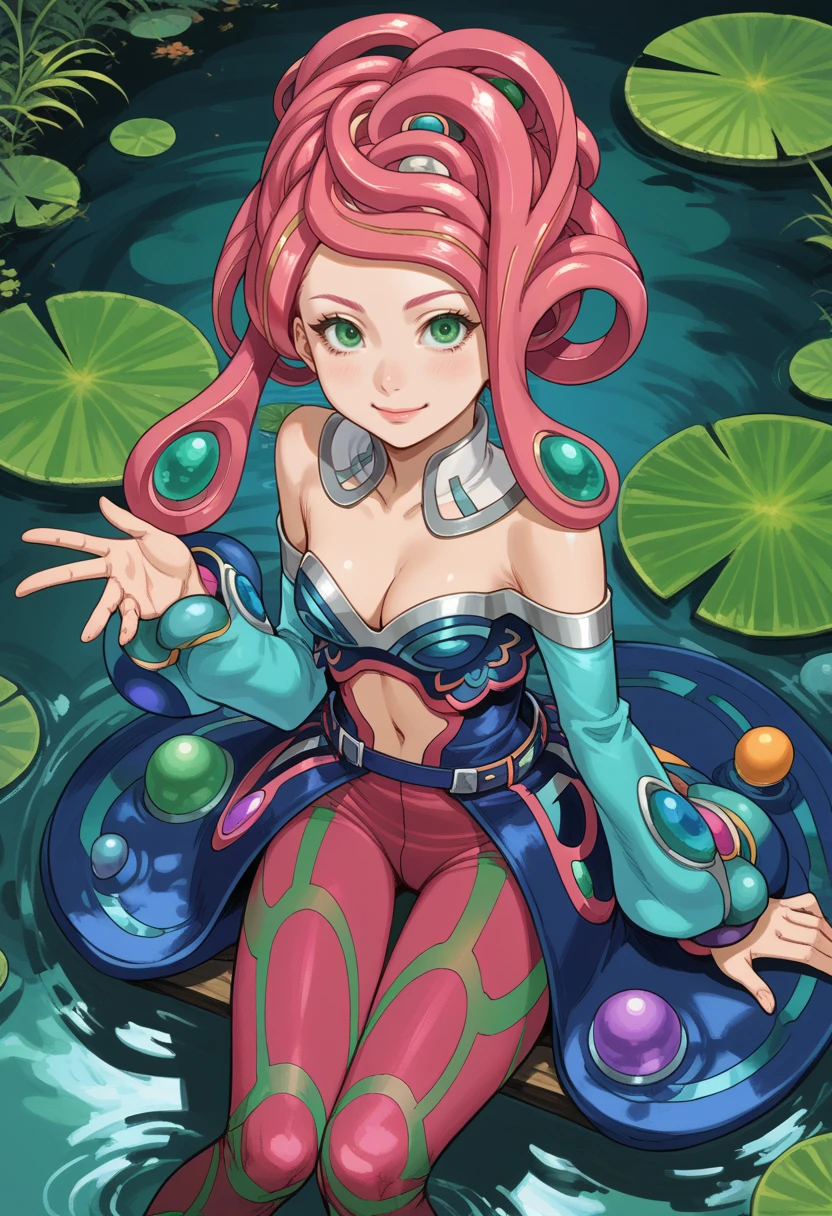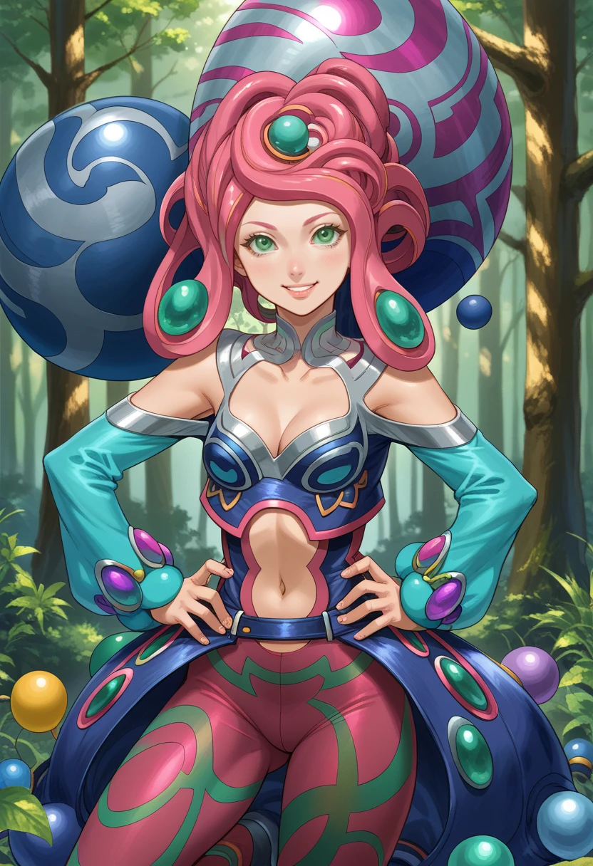 napaeasmt, pink hair, tentacle hair, green eyes, blue dress, detached sleeves, gloves, cleavage, navel cutout, pink pantyhose, balloons