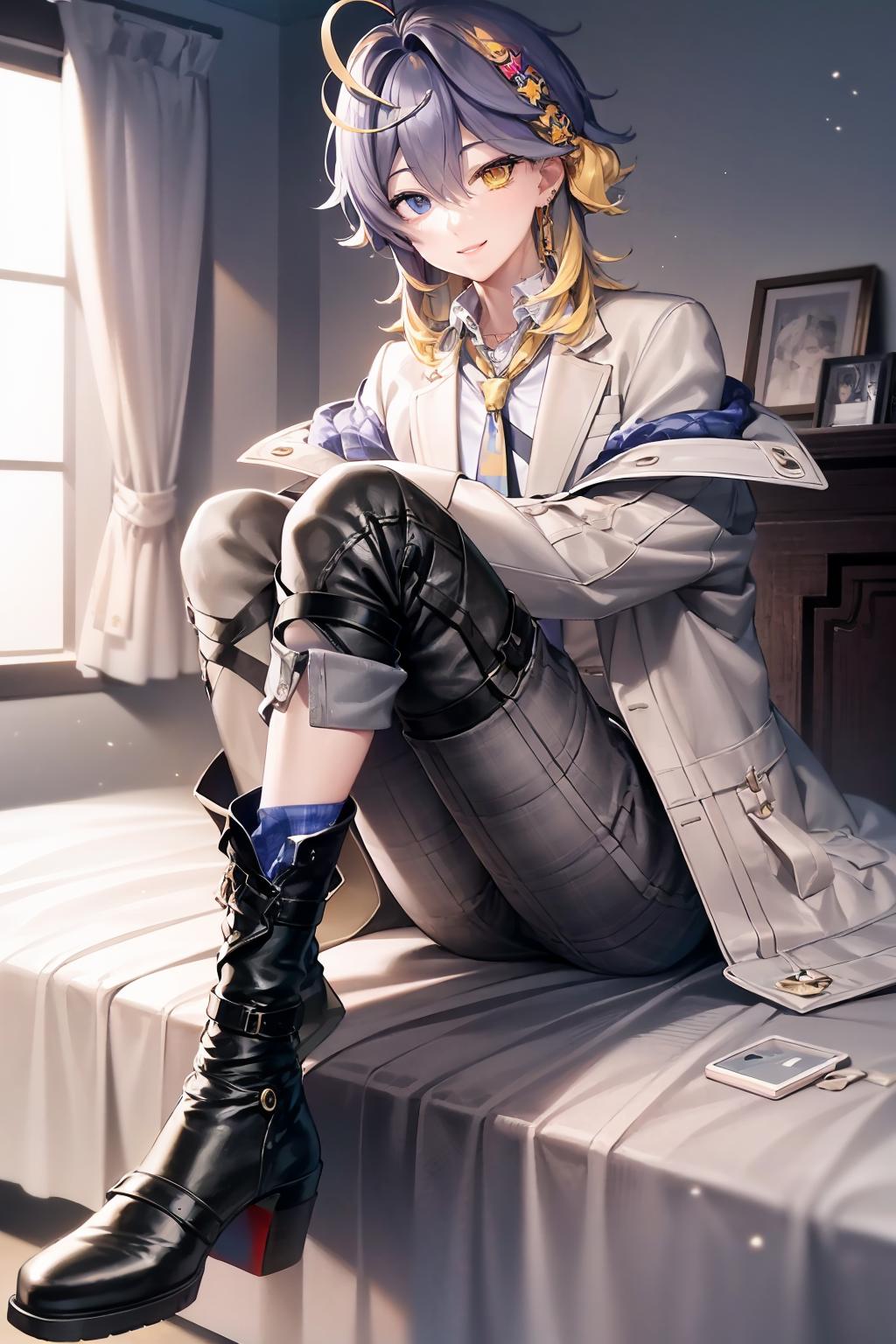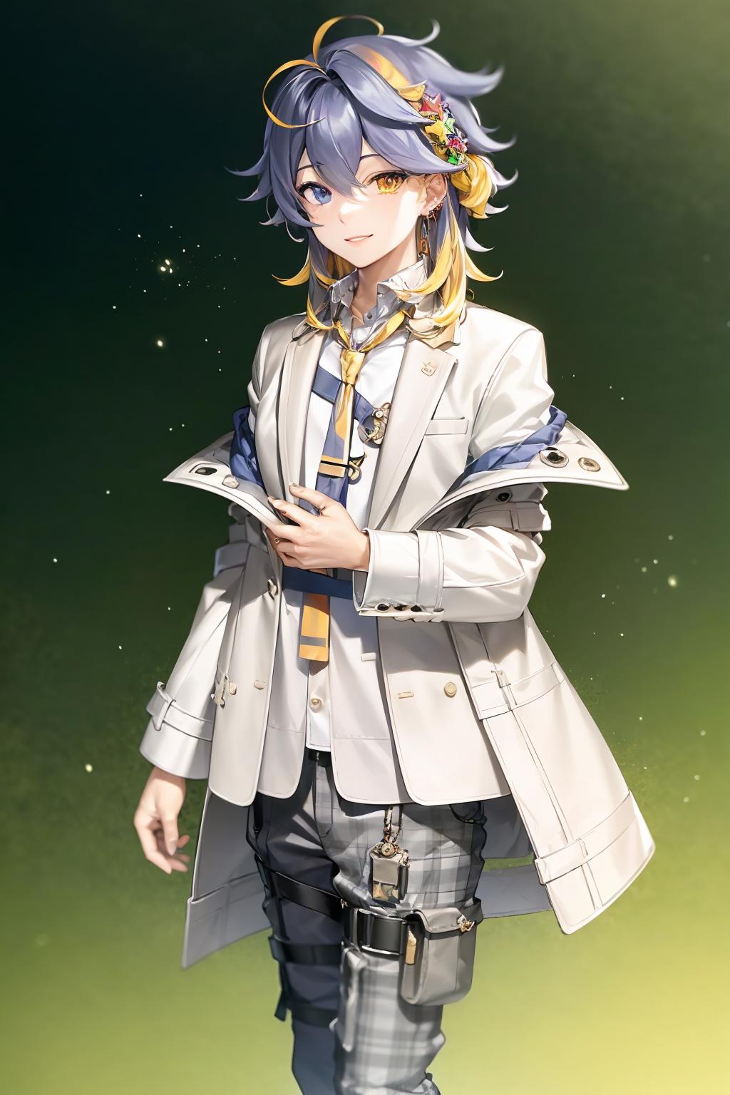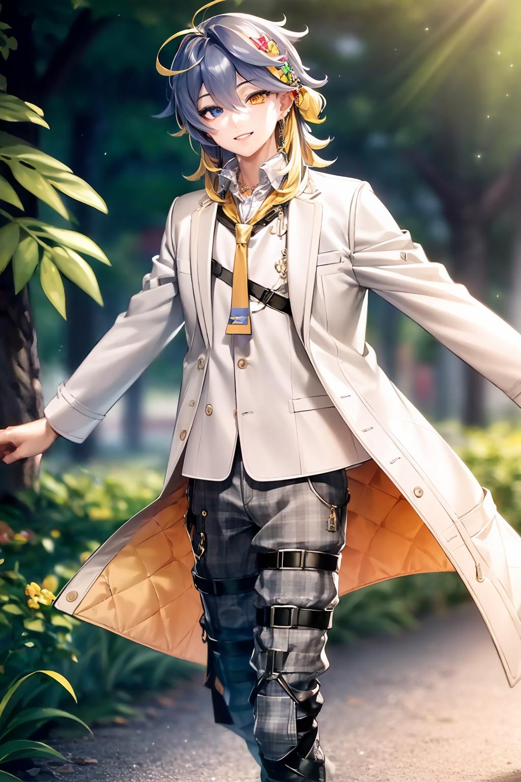 For default look prompt asterarc, shirt, hair ornament, jewelry, long white jacket, plaid pants, boots, tie, heterochromia
