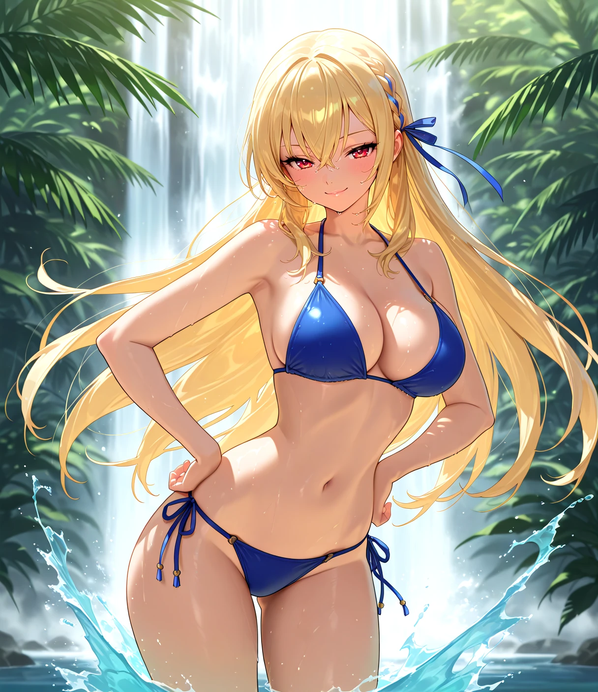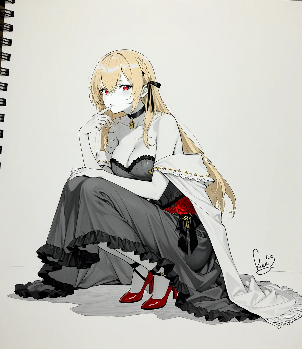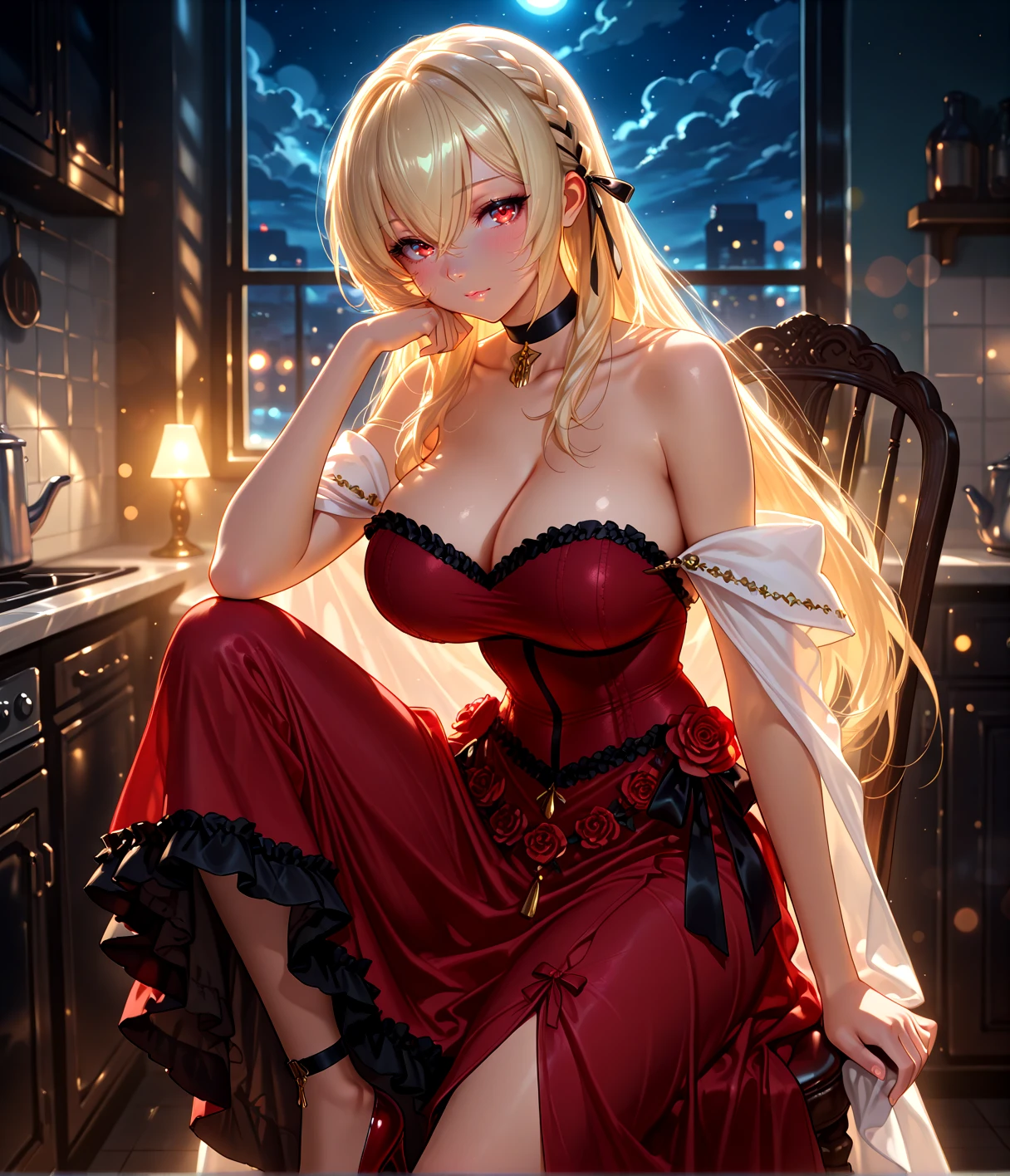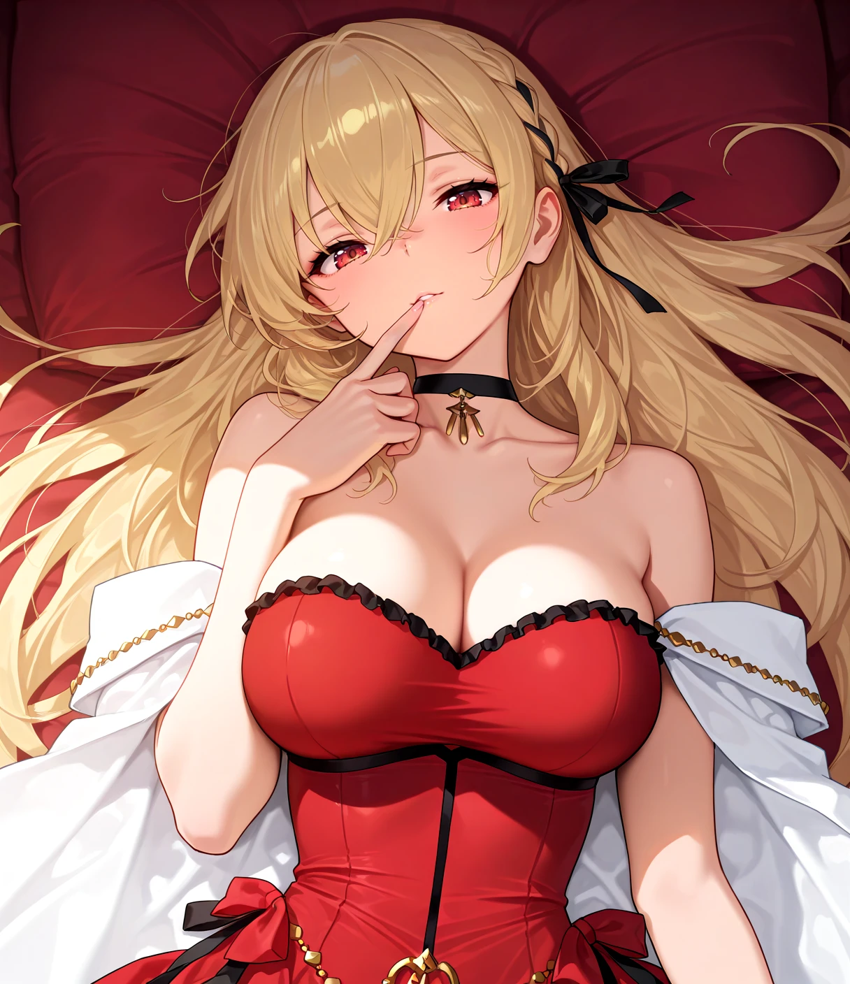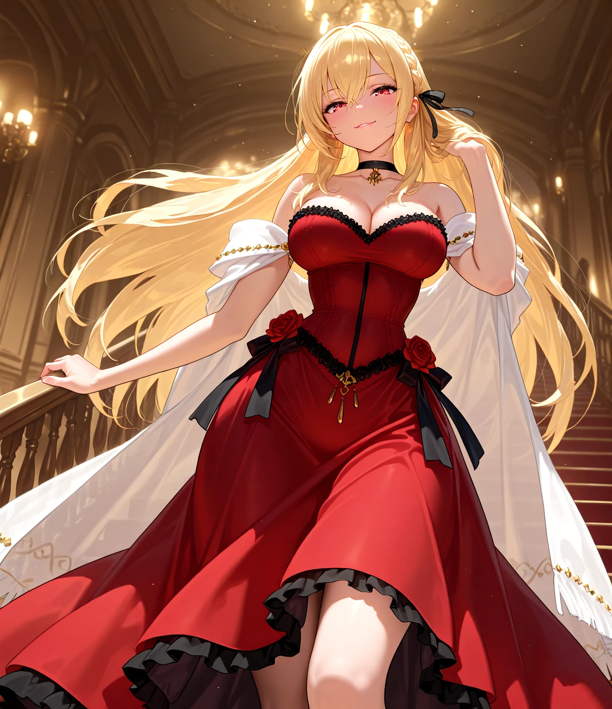 KGVdress, blonde hair, long hair, french braid, ribbon braid, hair ribbon, hair between eyes, red eyes, large breasts,cleavage, black choker, collarbone, red strapless dress, long dress, frills, off shoulder, white shawl, side bow, red bow, black bow, gold jewelry, red flower trim, red high heels, ankle strap,