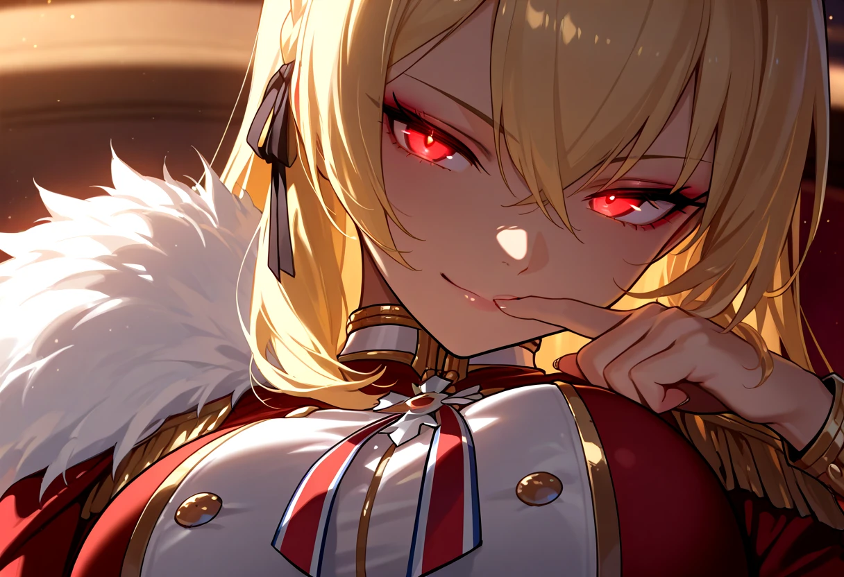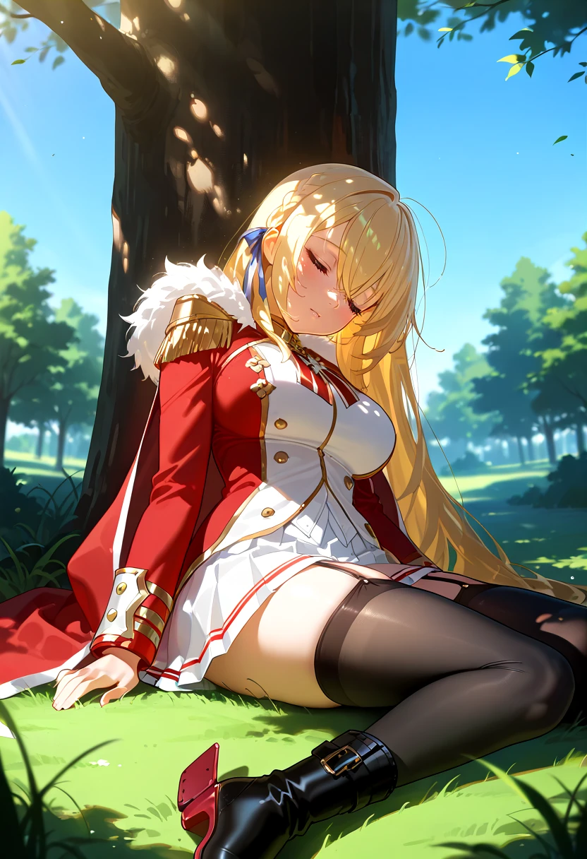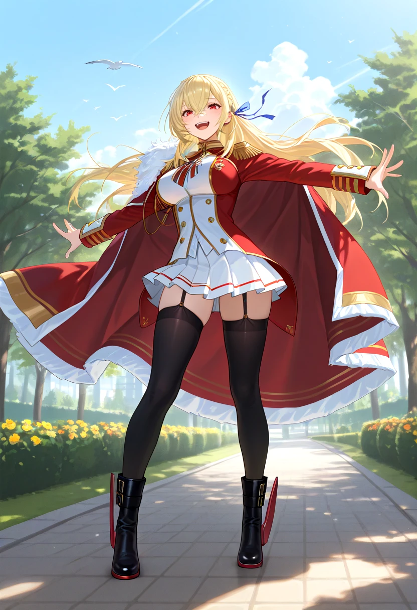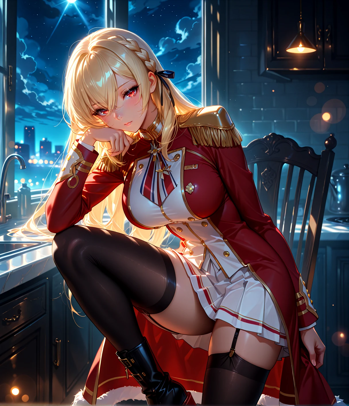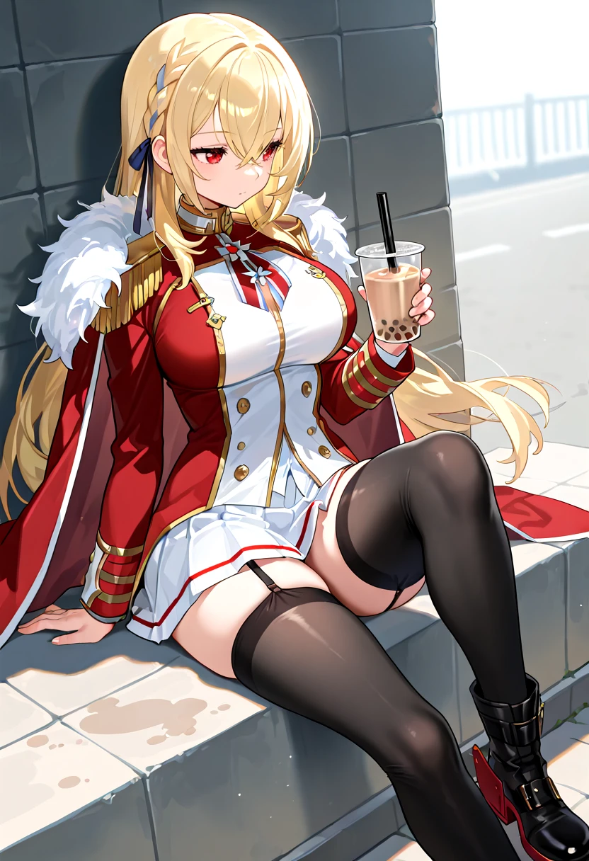 KGVdef, blonde hair, long hair, french braid, ribbon braid, hair ribbon, hair between eyes, red eyes, large breasts, military uniform, red coat, fur trim, gold trim, white pleated skirt, short skirt, double-breasted, neck ribbon, epaulettes, garter straps, black thighhighs, ankle boots, buckle boots, rudder footwear, zettai ryouiki,