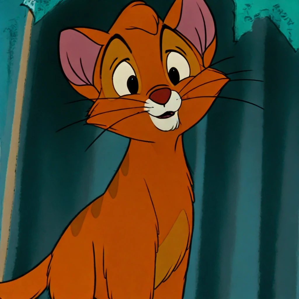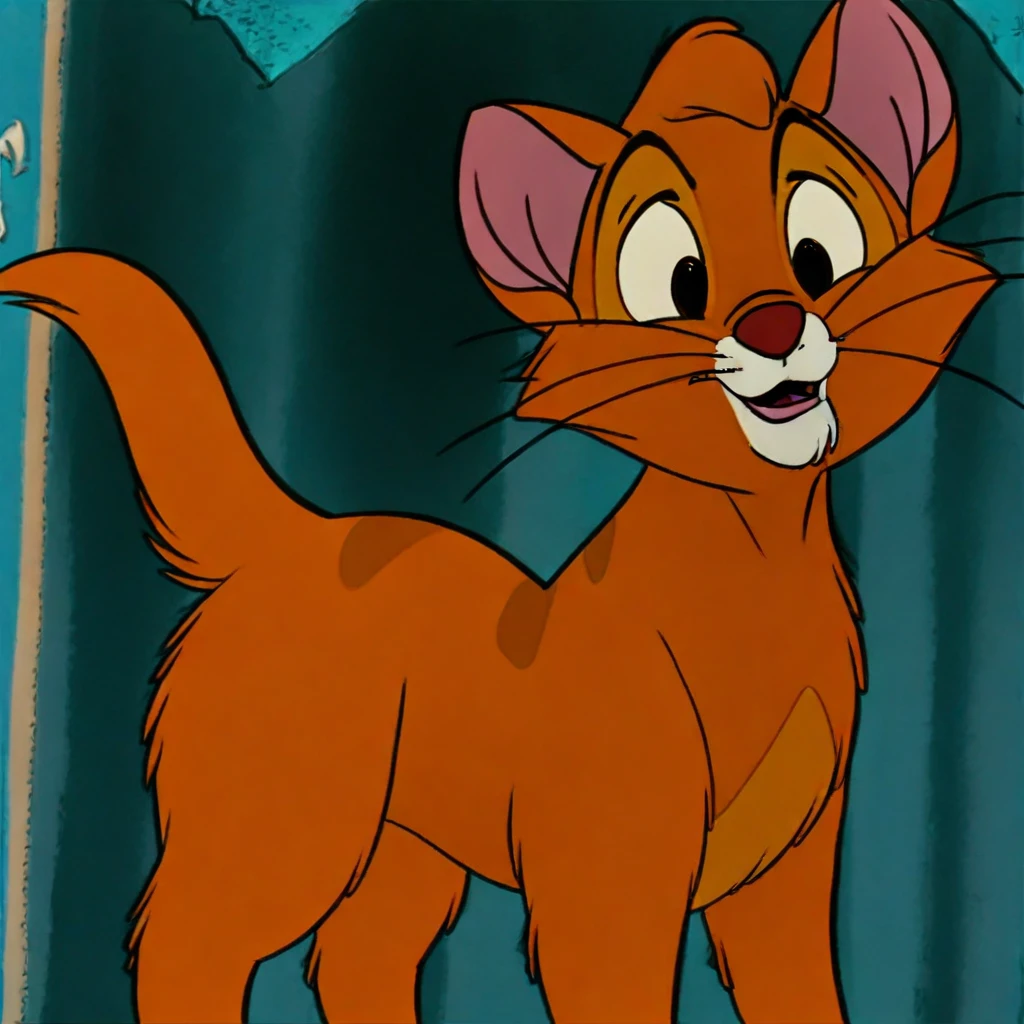 Oliver, male, disney cat ,orange fur, brown eyes,happy smile,cat ears,