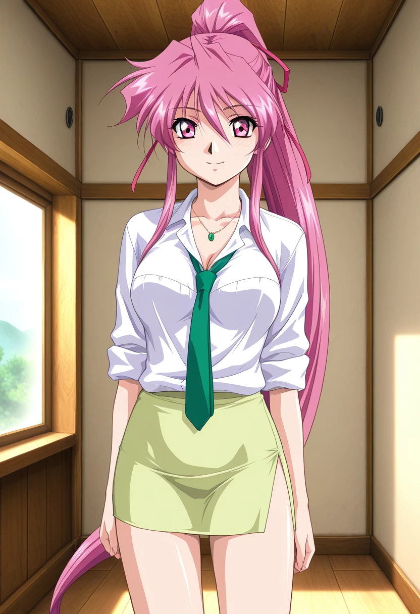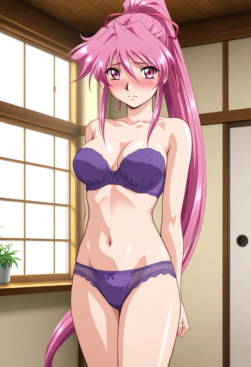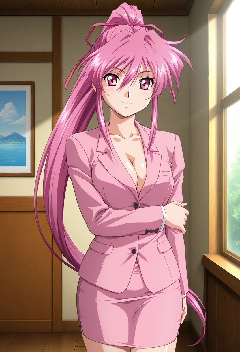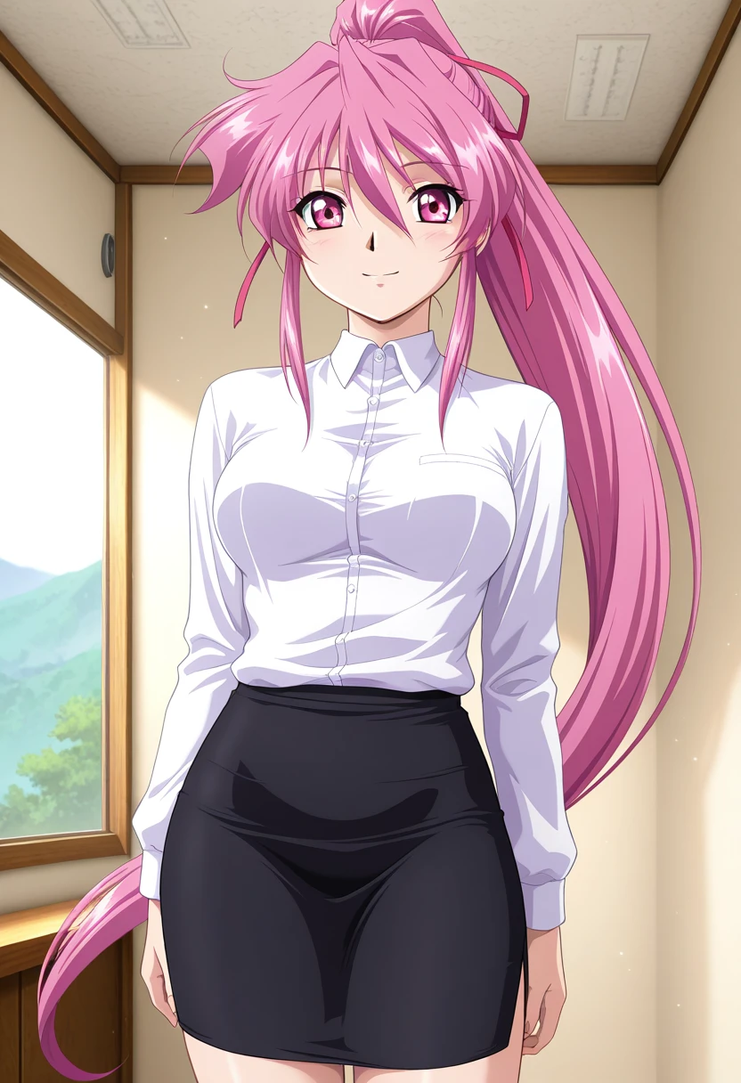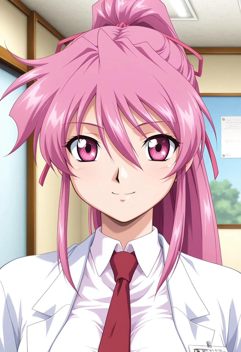 kaoriww, pink eyes, pink hair, long hair, very long hair, asymmetrical bangs, hair between eyes, sidelocks, high ponytail, red hair ribbon, medium breasts,