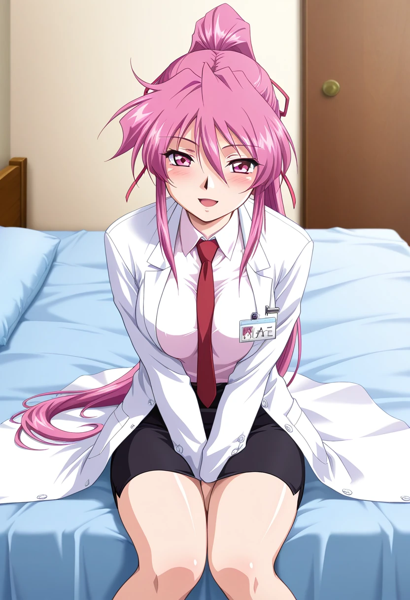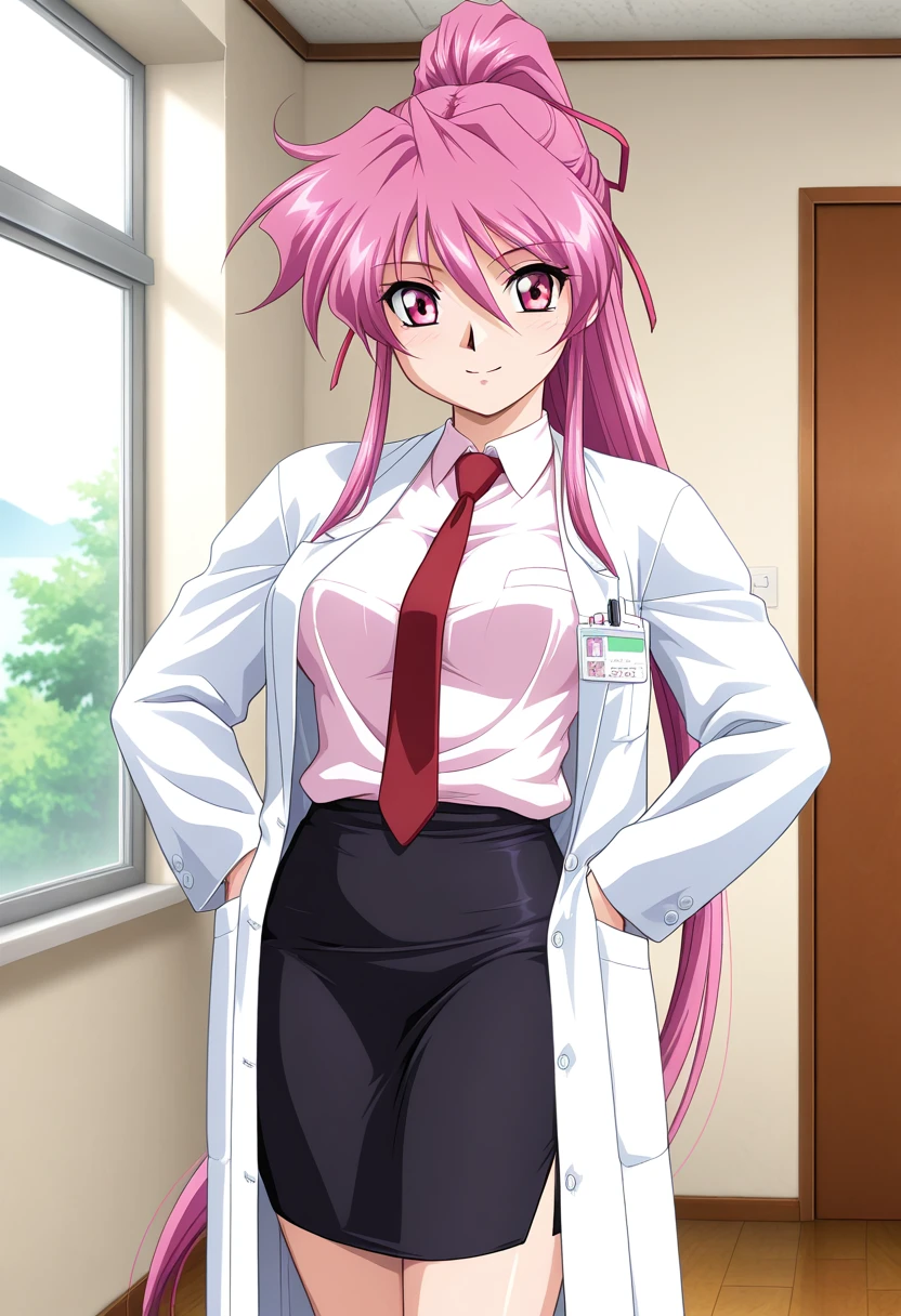 lab coat, name tag, red necktie, white collared shirt, long sleeves, black pencil skirt,