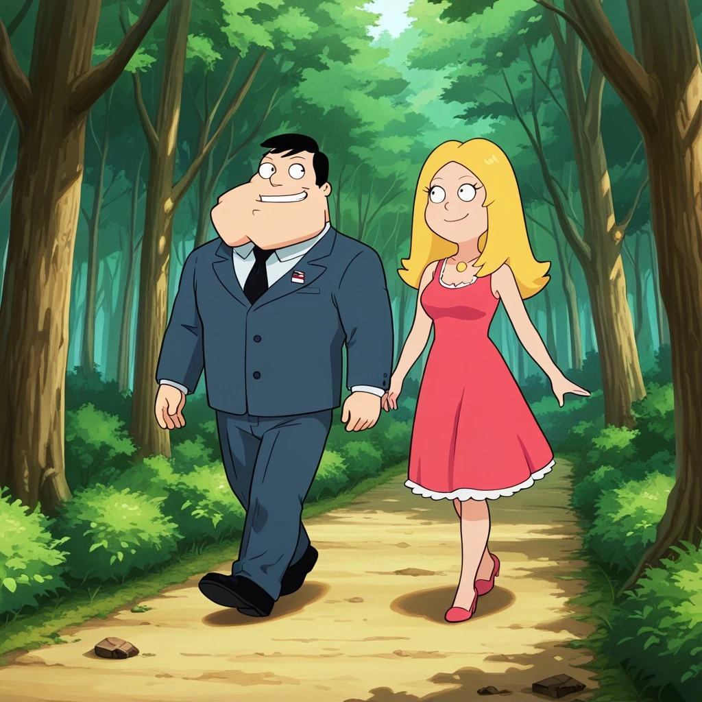 stancine_s, (1boy, stan_s, black hair, shirt, pants, tie), break, (1girl, francine_s, blonde hair, dress)