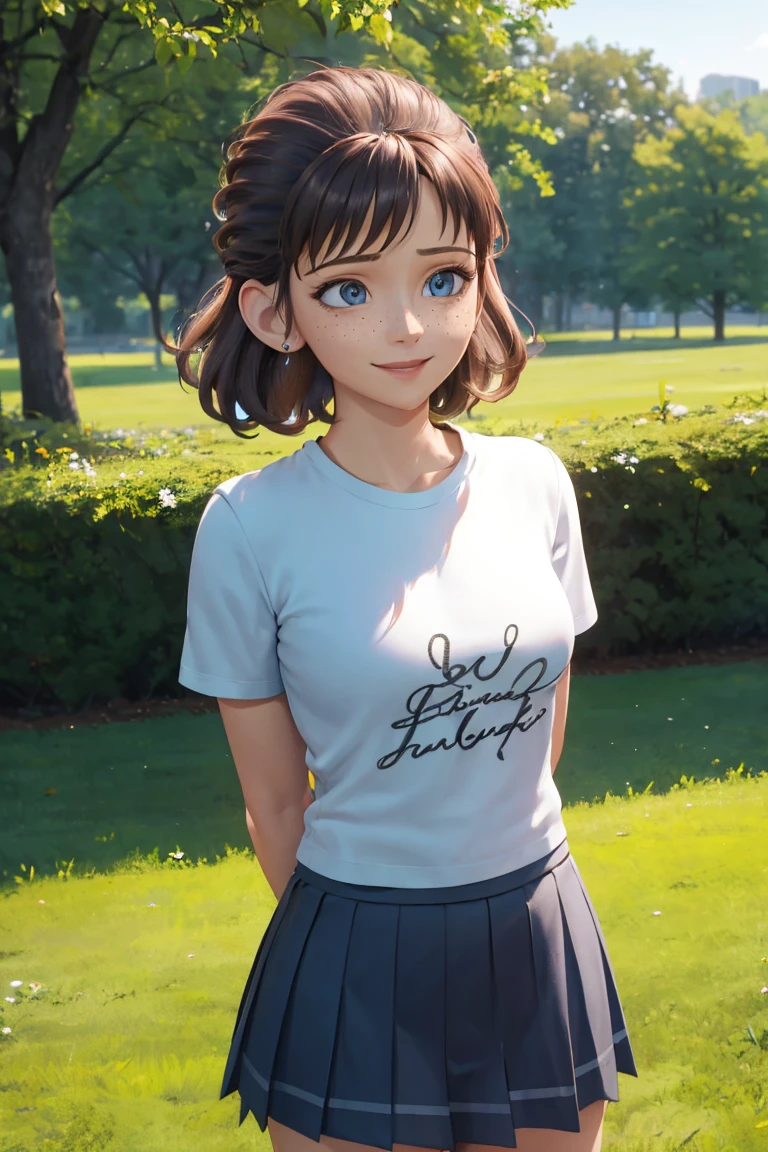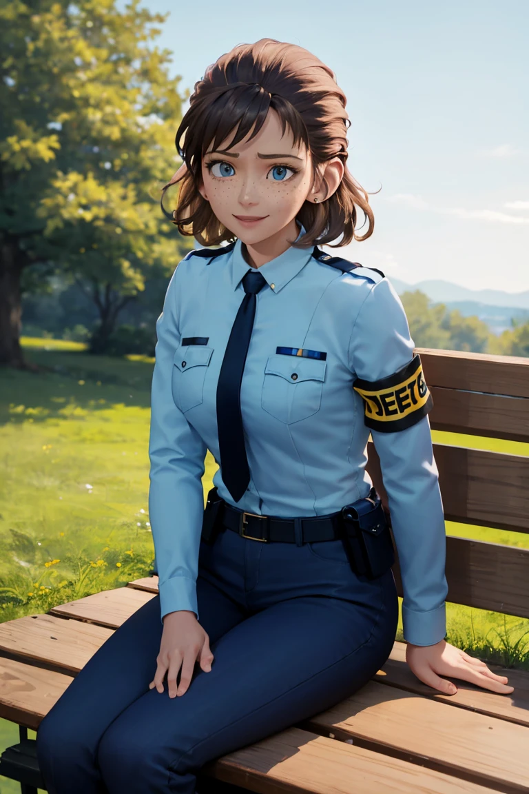 Laetitia, freckles, short hair, short ponytail, earrings, policewoman, police uniform, collared shirt, long sleeves, armband, black necktie, pants