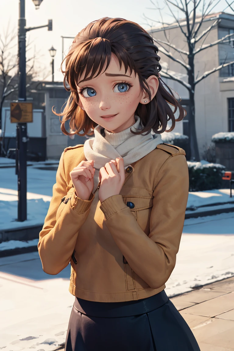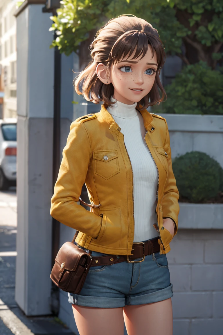 Laetitia, freckles, short hair, short ponytail, earrings, yellow jacket, partially unzipped, turtleneck, white shorts, brown belt, belt pouch, knee boots