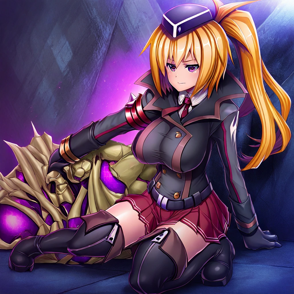 main; military uniform,garrison cap,jacket,long sleeves,red necktie,black gloves,pleated skirt,thigh boots,