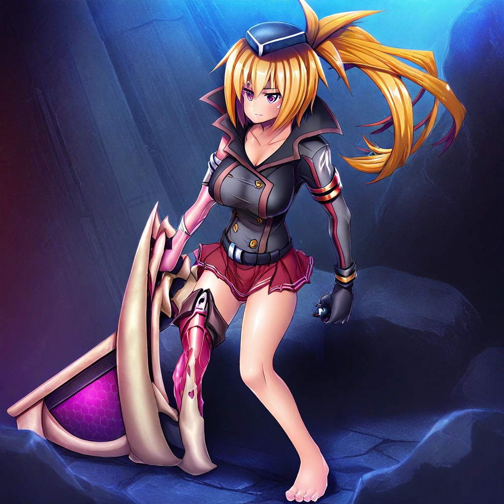 charactor: donna_barows,purple eyes,blonde hair,ponytail,large breasts
